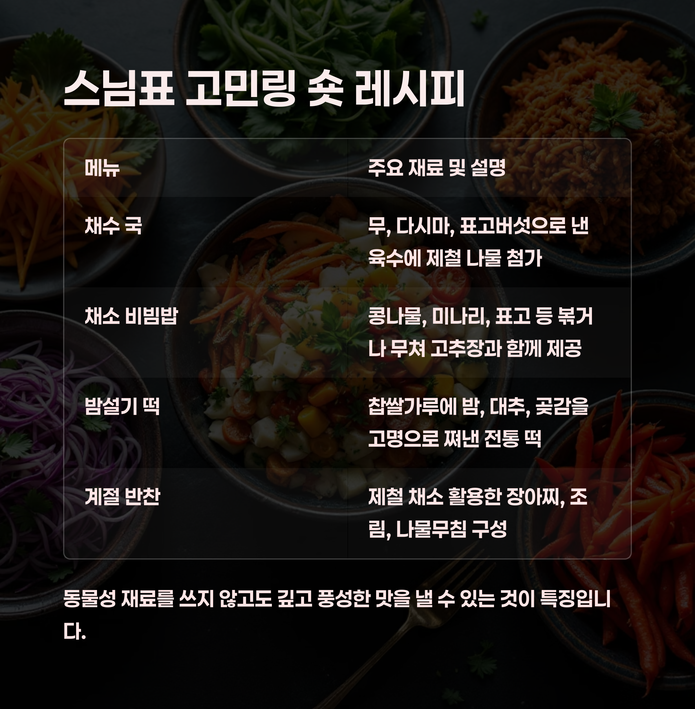 | 계절 반찬 | 제철 채소 활용한 장아찌, 조림, 나물무침 구성 |