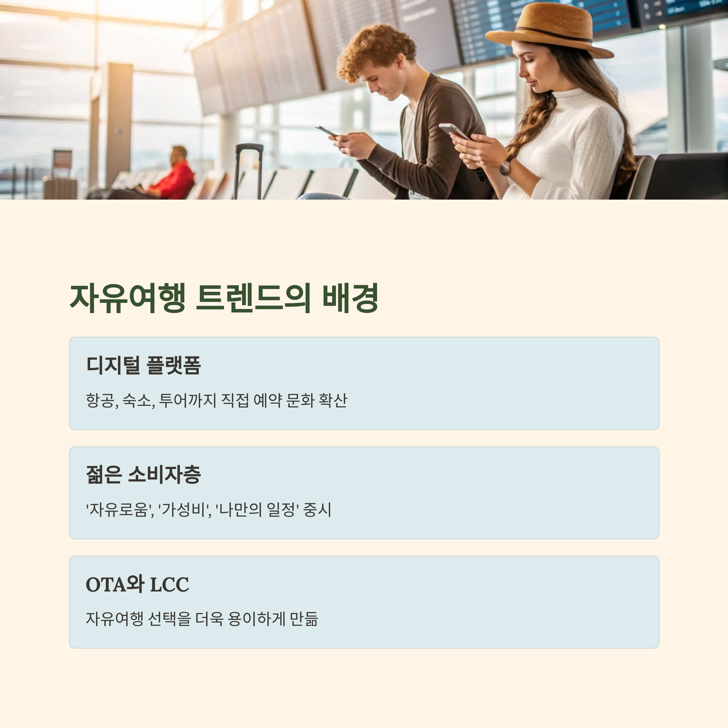 중요한 요인은 OTA 확산과 LCC 증가가 자유여행 선택을 용이하게 만들었다는 점입니다.