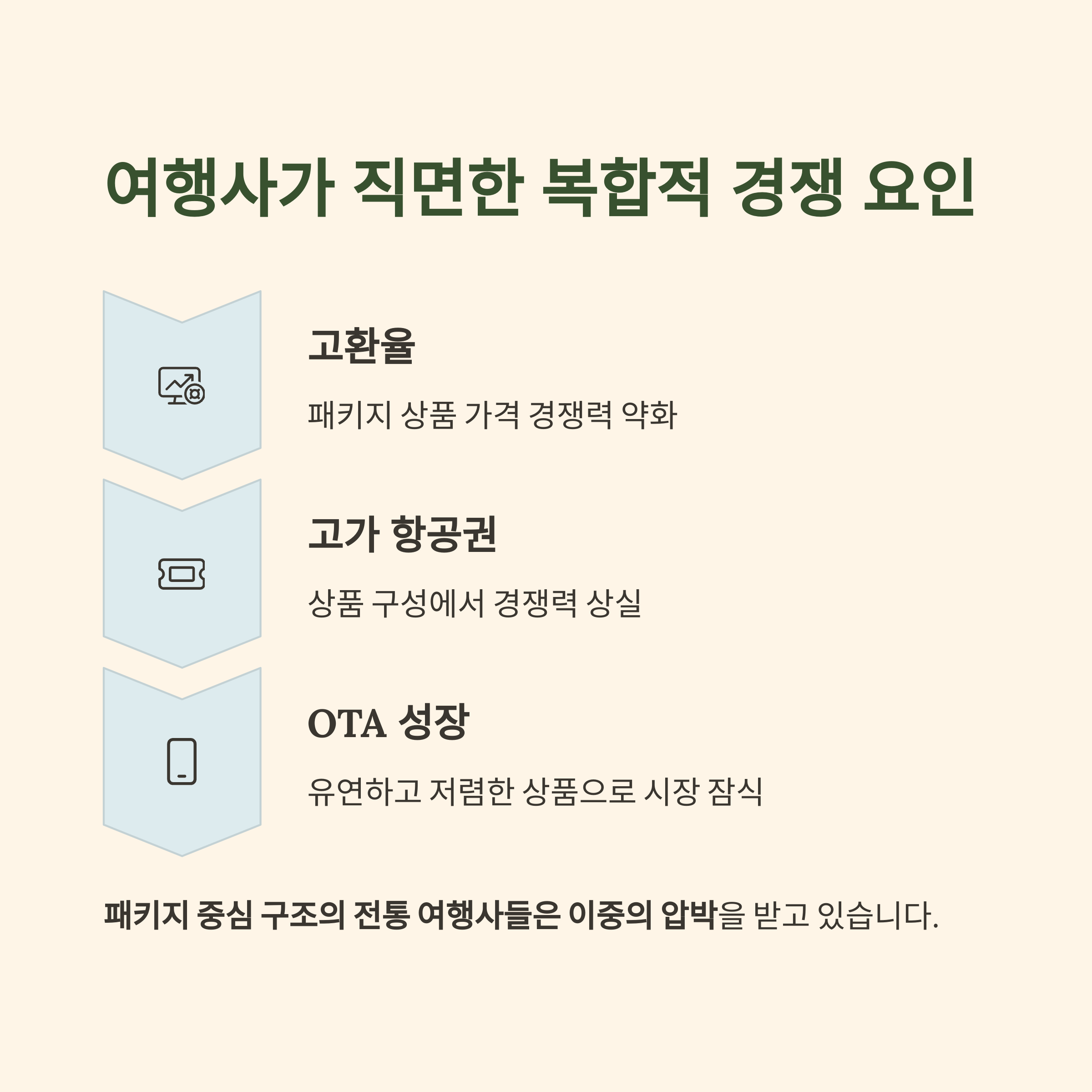 이로 인해 패키지 중심 구조의 전통 여행사들은 이중의 압박을 받고 있습니다.