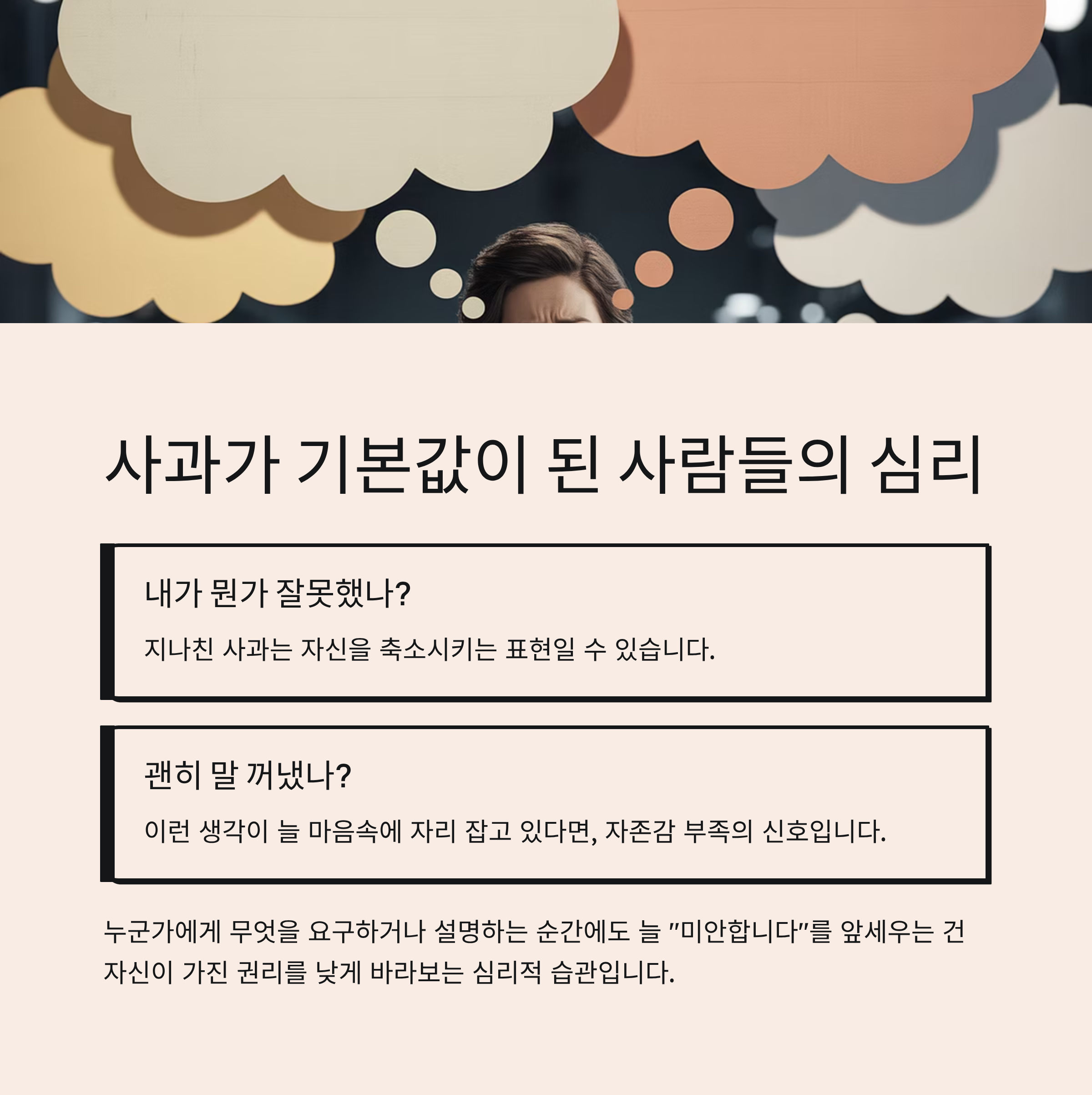 사과는 분명 성숙한 태도지만, 지나친 사과는 자신을 축소시키는 표현일 수 있습니다.