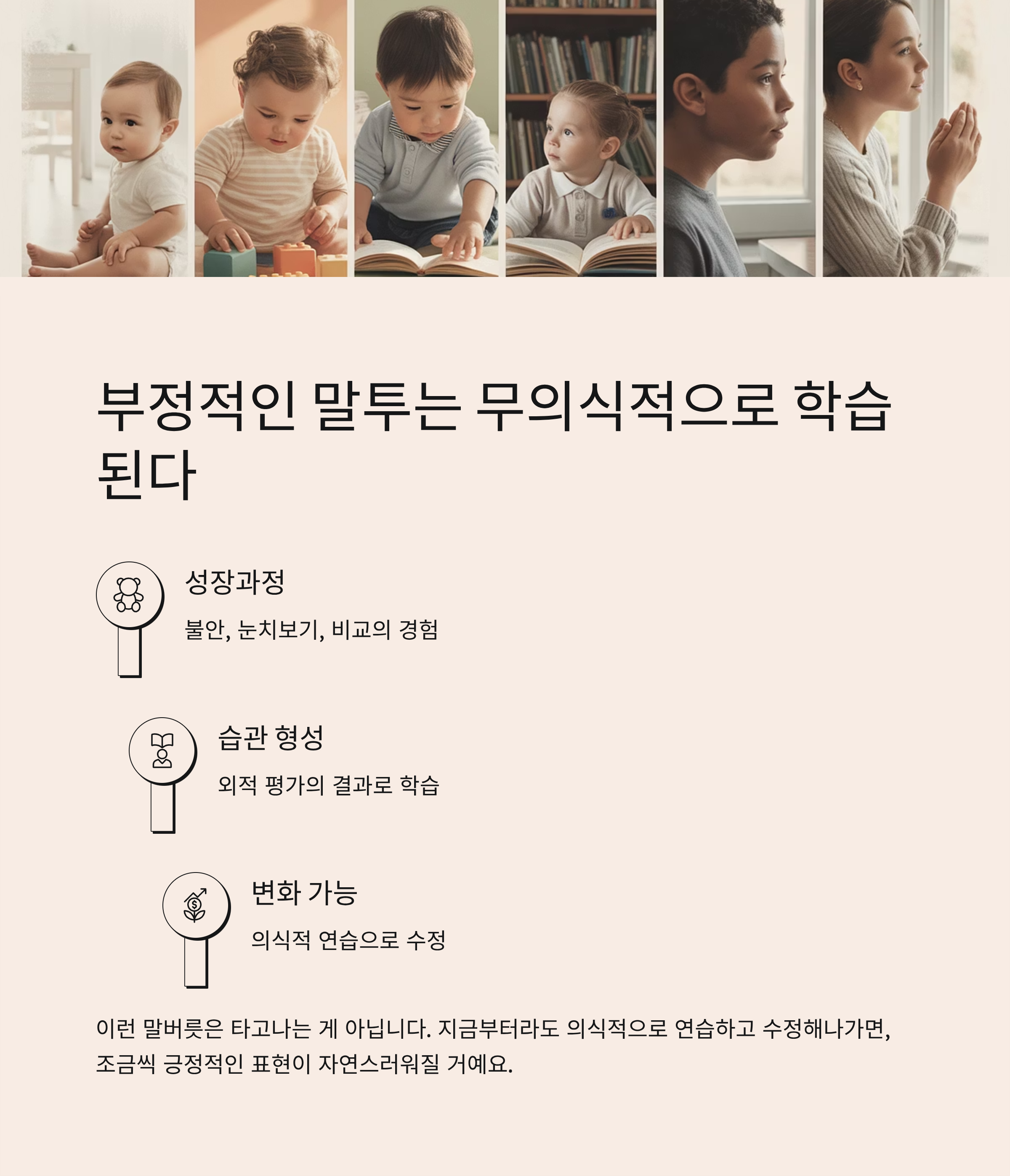 이런 말버릇은 타고나는 게 아니라, 대부분 성장과정에서 경험한 불안, 눈치보기, 비교, 외적 평가의 결과로 형성됩니다.