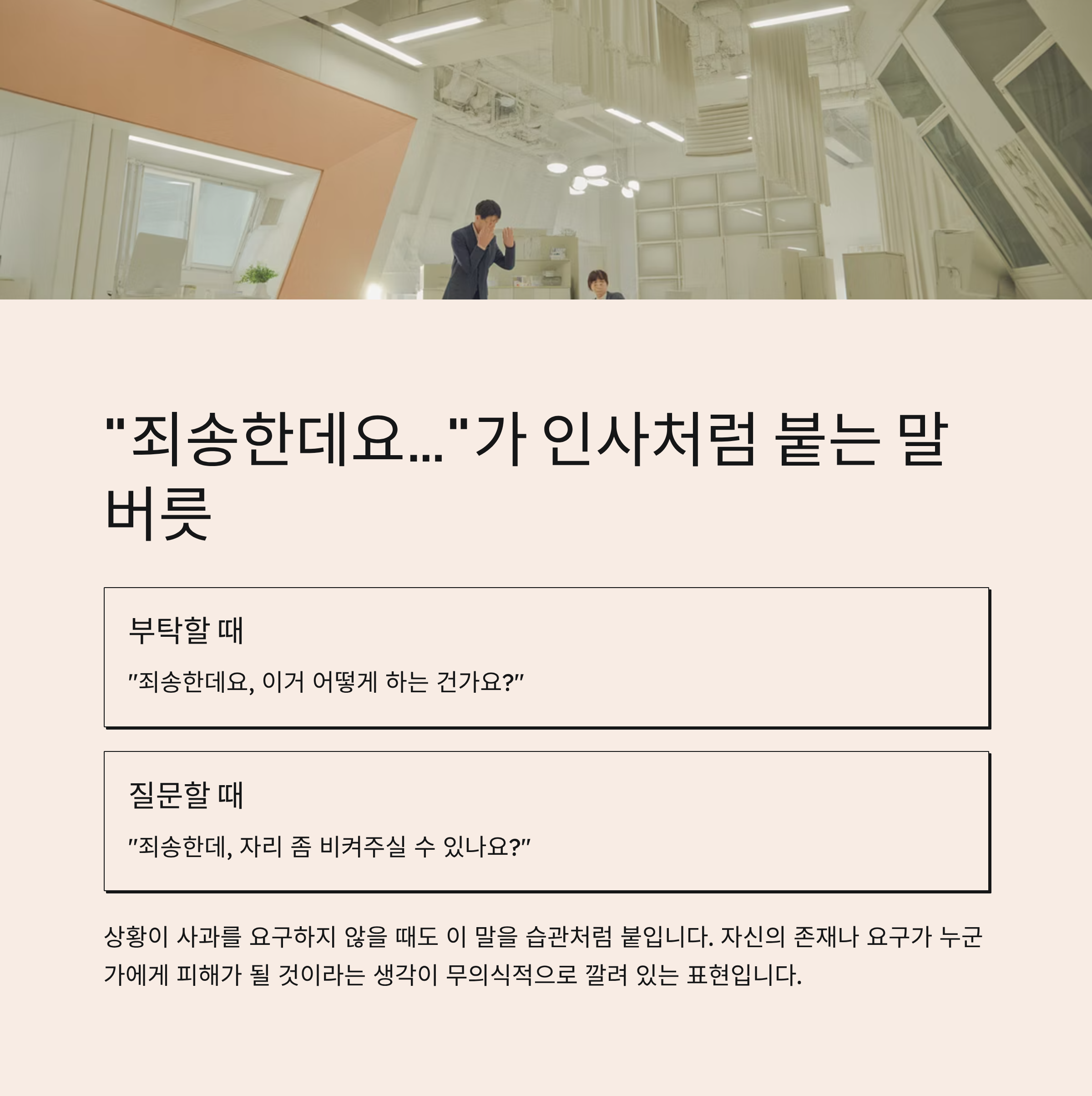 "죄송한데요…"로 시작하는 말은 부탁이나 질문을 할 때 자주 들립니다. 문제는, 상황이 ‘사과’를 요구하지 않을 때도 이 말을 습관처럼 붙인다는 겁니다.