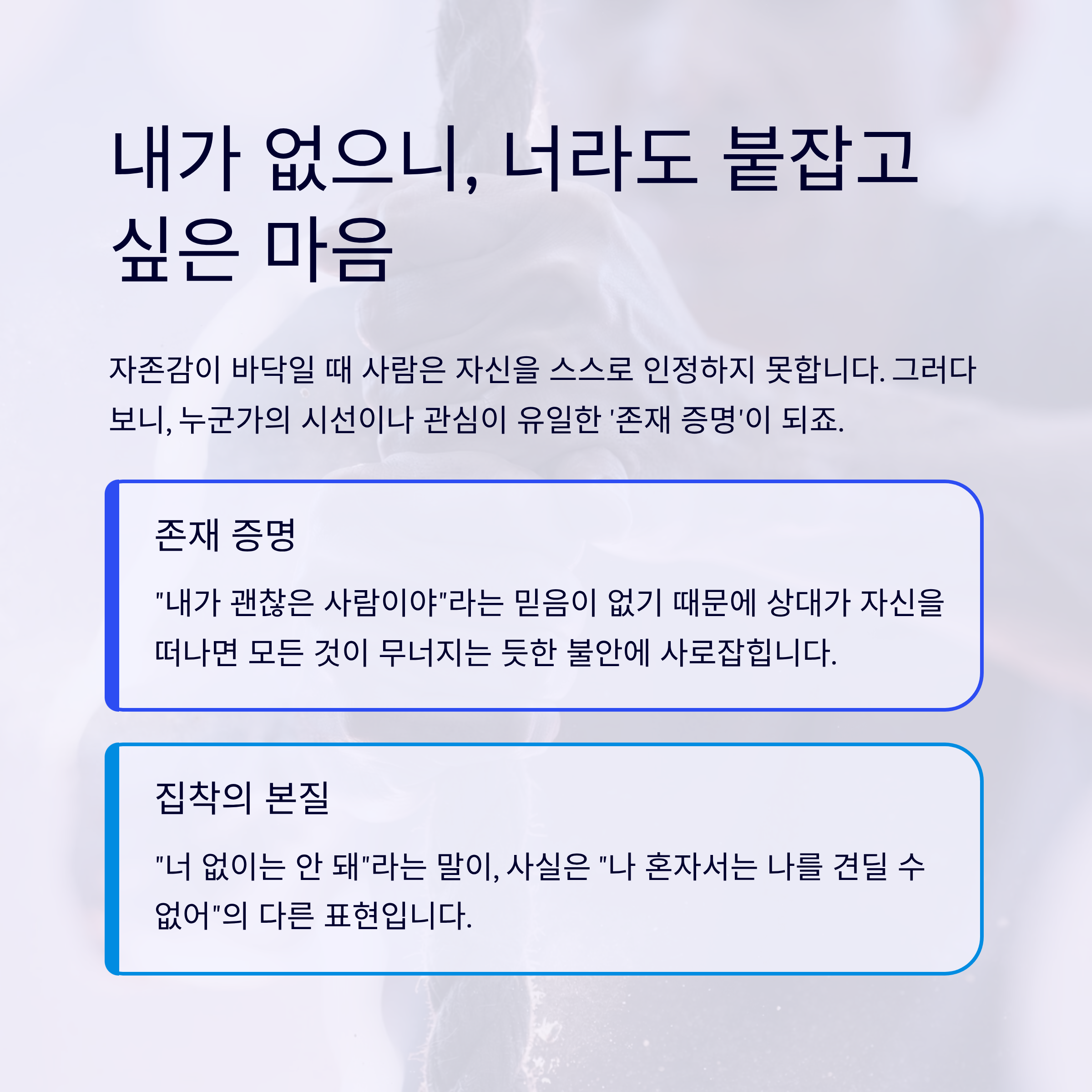 자존감이 낮을 때 우리는 누군가에게 인정받고 싶은 욕구가 강해집니다. 그 욕구는 때로 ‘집착’이라는 이름으로 나타나게 되죠. 이 글에서는 자존감이 낮은 사람이 왜 특정 인간관계에 더 집착하게 되는지, 그 심리적 배경과 함께 실제 생활에서 겪는 갈등의 양상을 풀어봅니다. 관계 속에서 자신을 잃지 않기 위한 힌트도 함께 담았습니다.