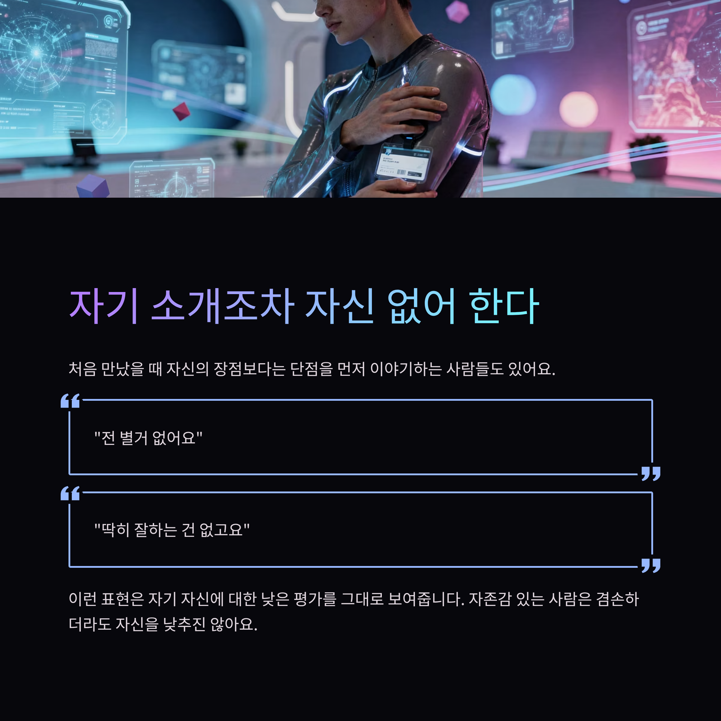 "전 별거 없어요", "딱히 잘하는 건 없고요" 같은 표현은 자기 자신에 대한 낮은 평가를 그대로 보여줍니다.
