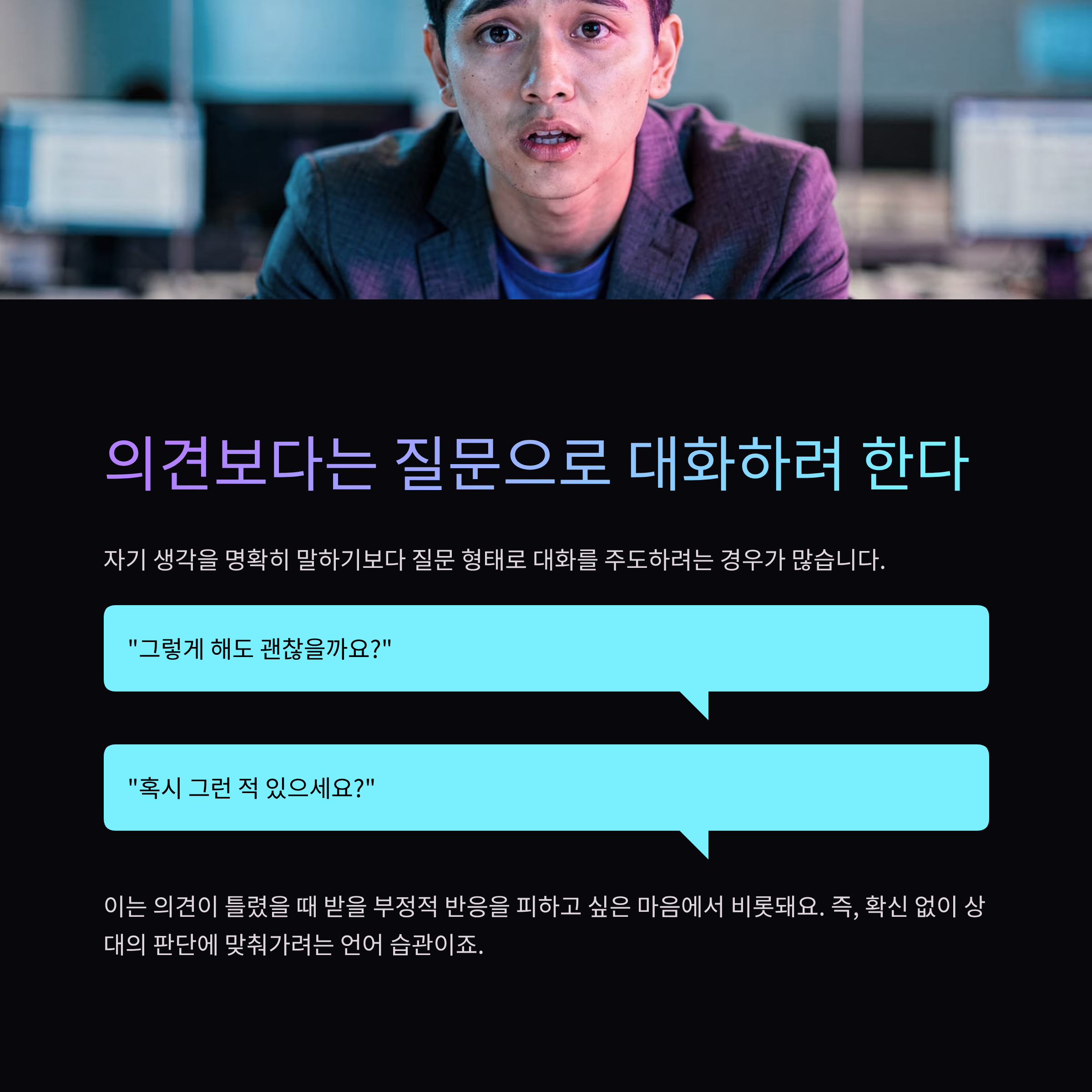 자기 생각을 명확히 말하기보다 "그렇게 해도 괜찮을까요?", "혹시 그런 적 있으세요?"처럼 질문 형태로 대화를 주도하려는 경우가 많습니다.