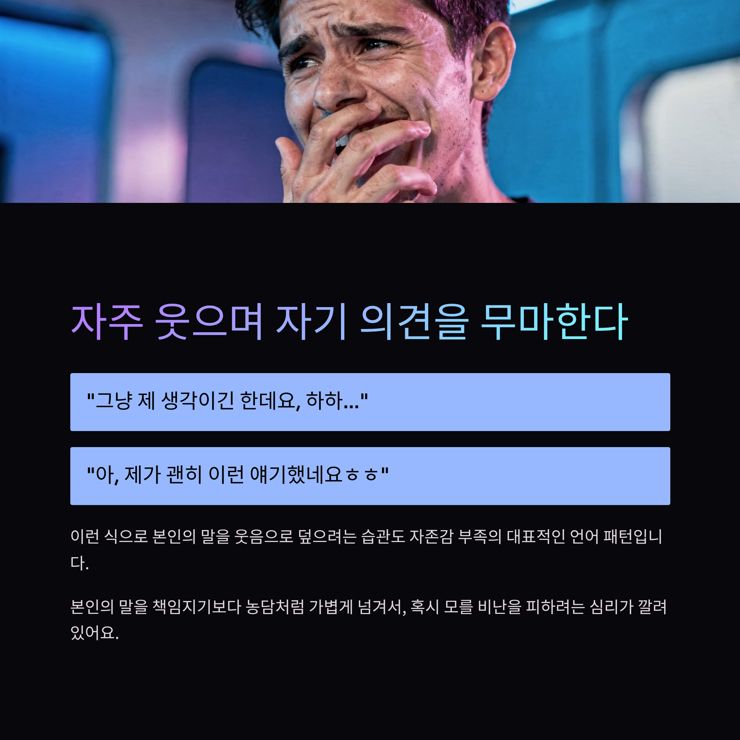이런 식으로 본인의 말을 웃음으로 덮으려는 습관도 자존감 부족의 대표적인 언어 패턴입니다. 본인의 말을 책임지기보다 농담처럼 가볍게 넘겨서, 혹시 모를 비난을 피하려는 심리가 깔려 있어요.