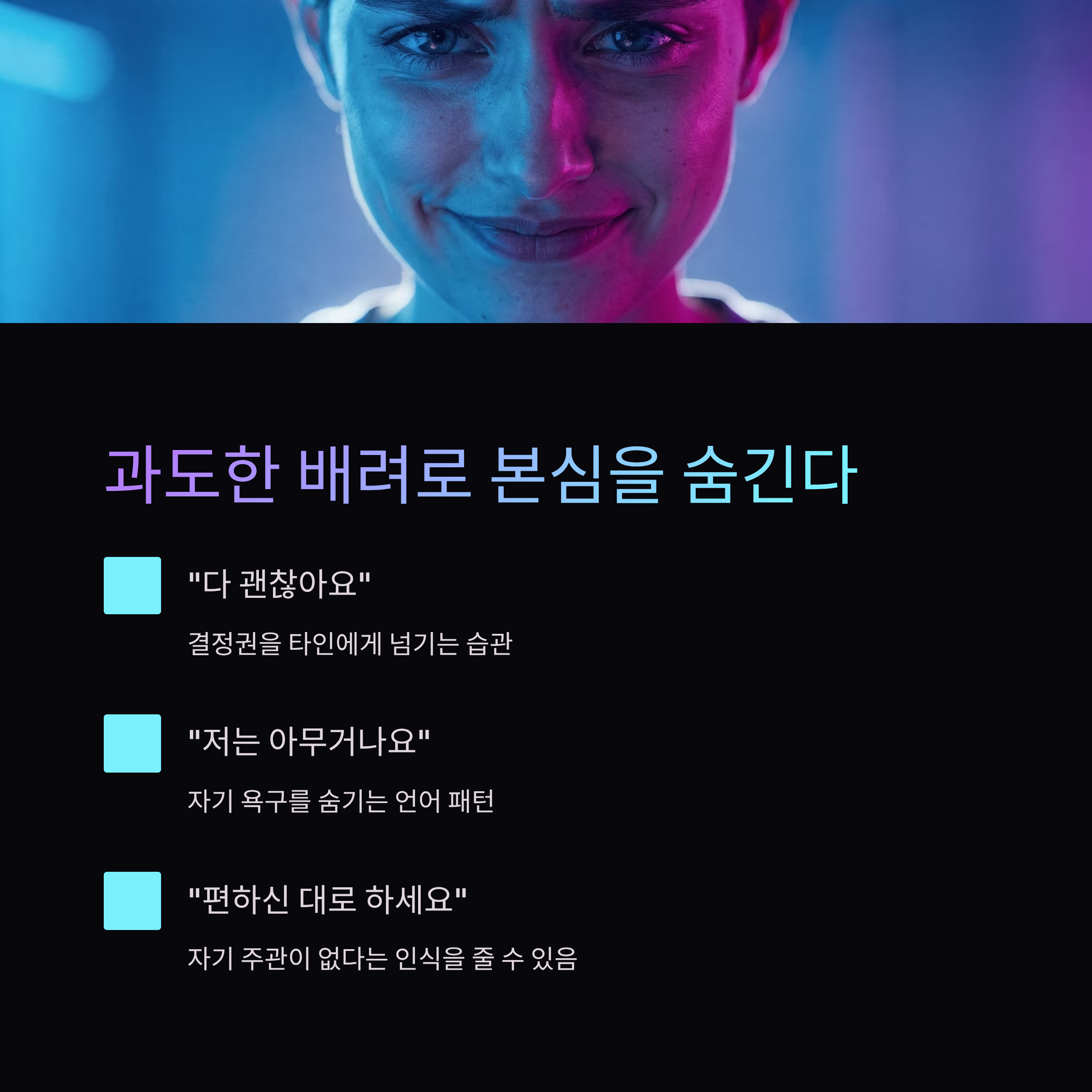 이렇게 말하는 게 배려처럼 보일 수도 있지만, 반복되면 오히려 자기 주관이 없는 사람이라는 인식을 주기도 하죠.