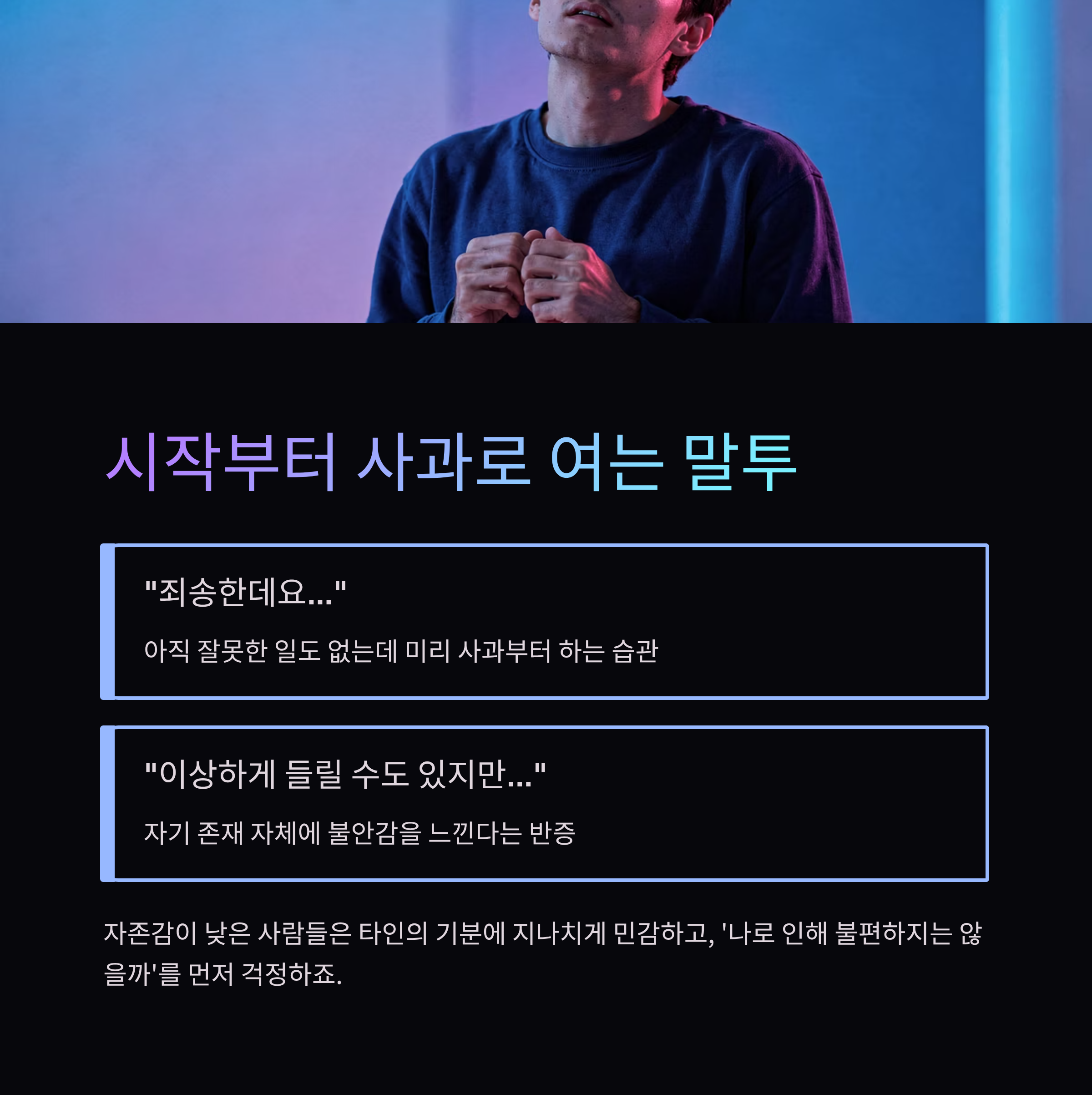 아직 상대방이 불쾌해하지도 않았고, 잘못한 일도 없는데 미리 사과부터 하는 건 자기 존재 자체에 불안감을 느낀다는 반증이기도 해요. 자존감이 낮은 사람들은 타인의 기분에 지나치게 민감하고, '나로 인해 불편하지는 않을까'를 먼저 걱정하죠.