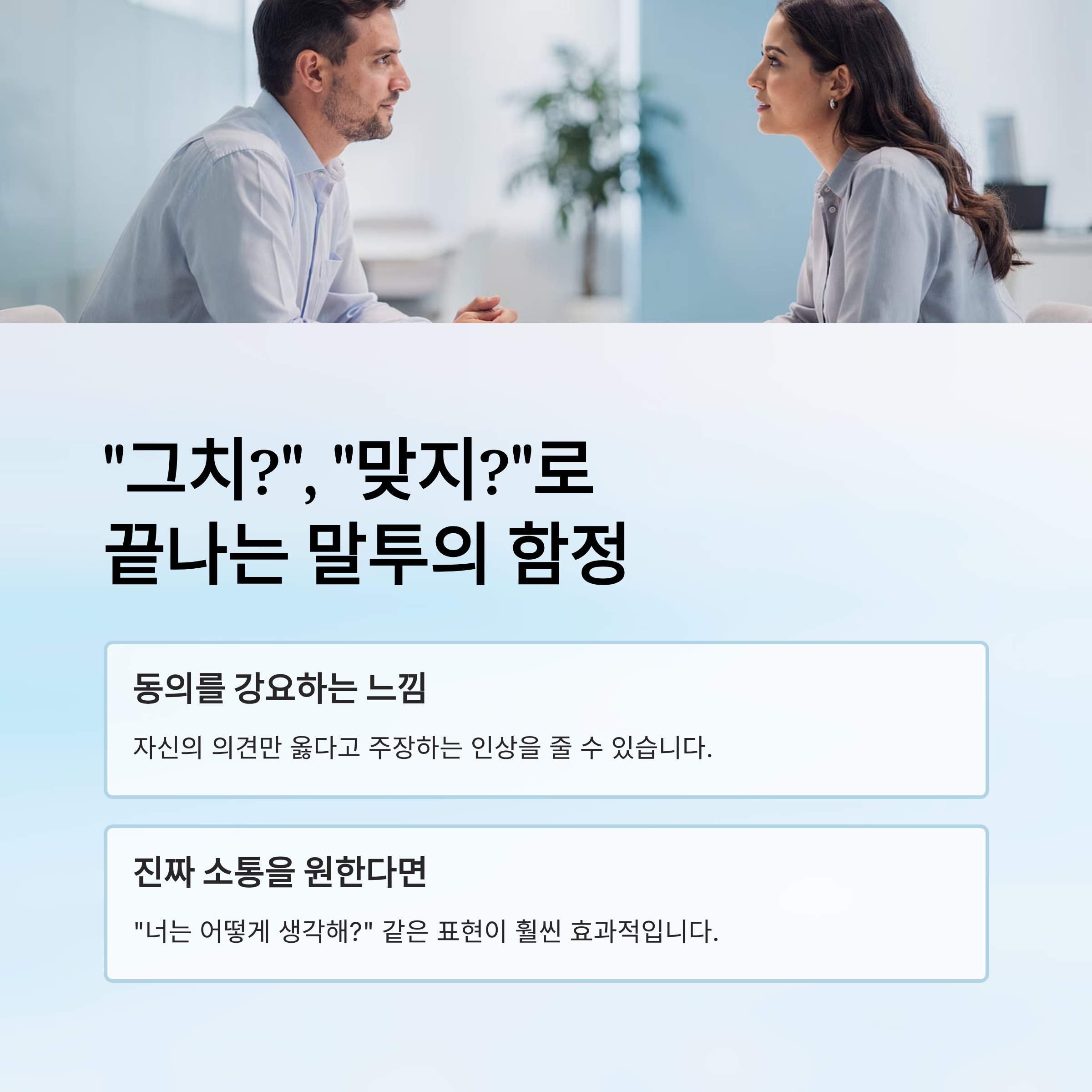진짜 소통을 원한다면 "너는 어떻게 생각해?" 같은 표현이 훨씬 효과적입니다.