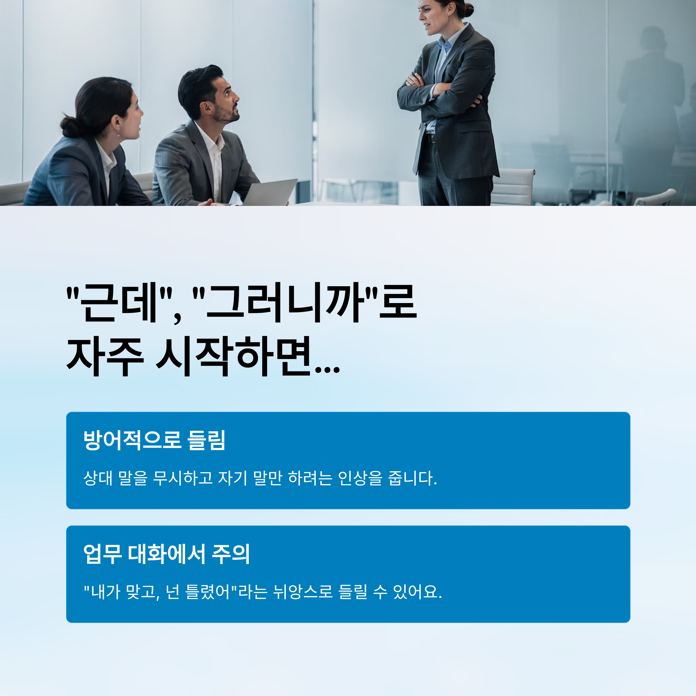 이런 말투는 종종 방어적으로 들리거나 상대 말을 무시하고 자기 말만 하려는 인상도 줍니다.