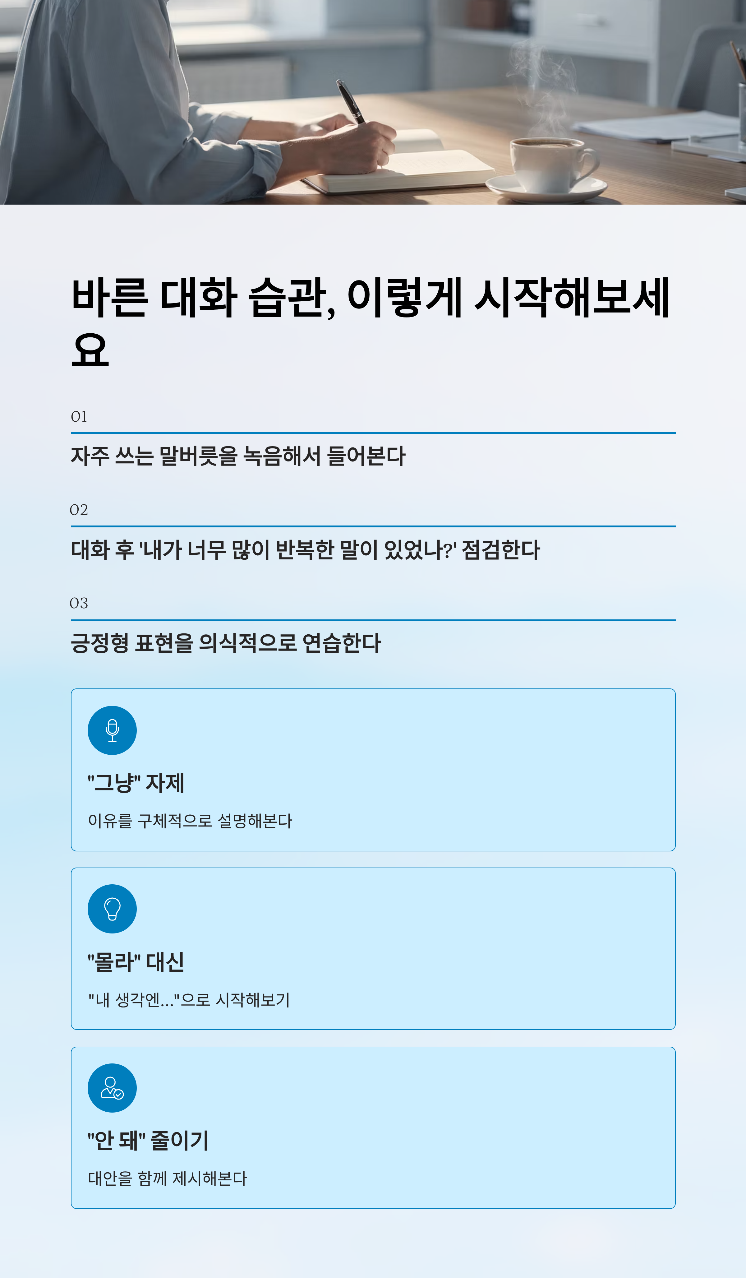 대화는 관계를 맺는 가장 직접적인 방법입니다. 그런데 반복해서 등장하는 특정 단어나 말투가 상대에게 피로감을 주고, 결국 신뢰를 무너뜨릴 수도 있다는 사실, 알고 계셨나요? 이번 글에서는 평소에 자주 쓰는 말버릇이 대화에 어떤 영향을 미치는지, 그리고 어떻게 바꾸면 좋은지 함께 이야기해보겠습니다.