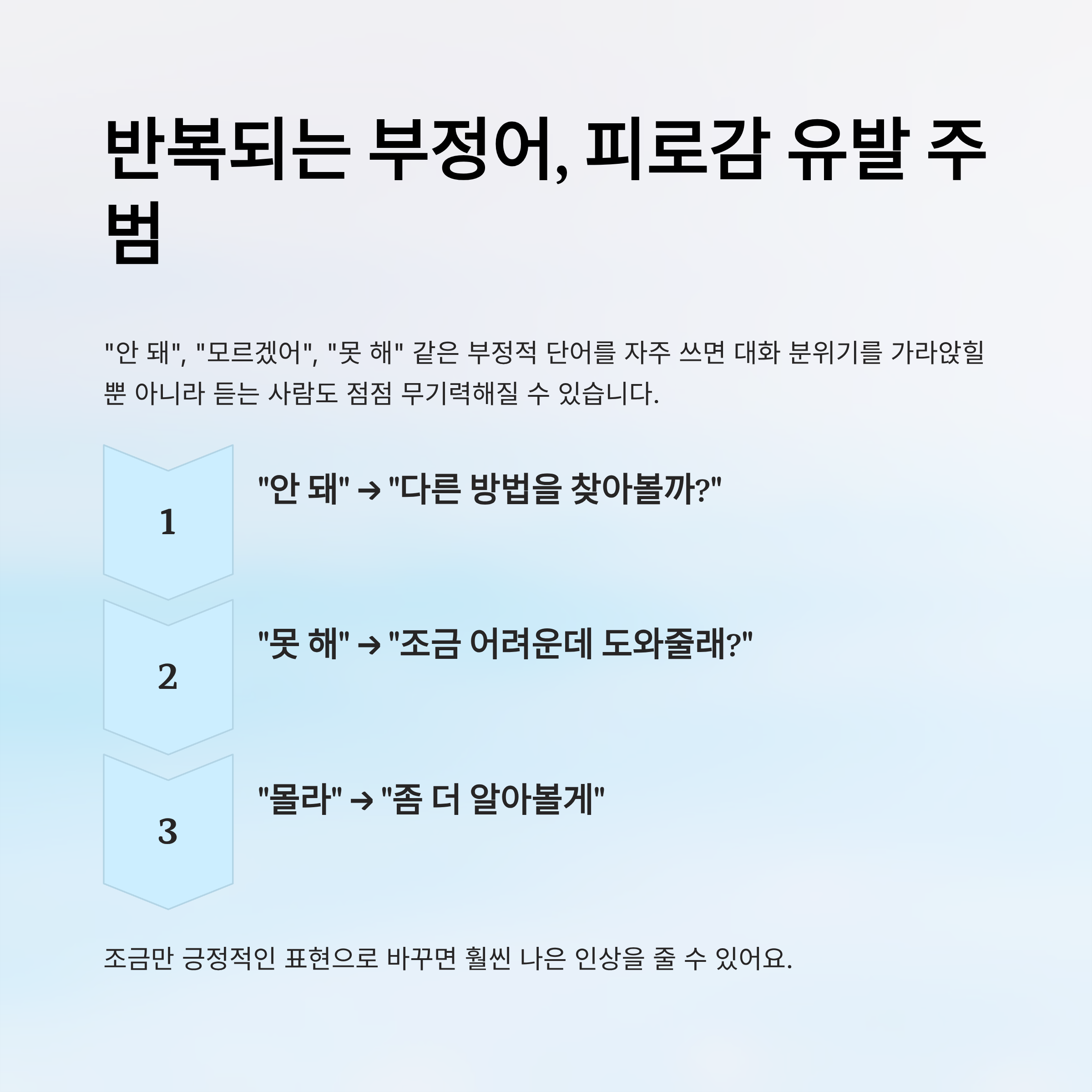이런 부정적인 단어를 자주 쓰면 대화의 분위기를 가라앉힐 뿐 아니라