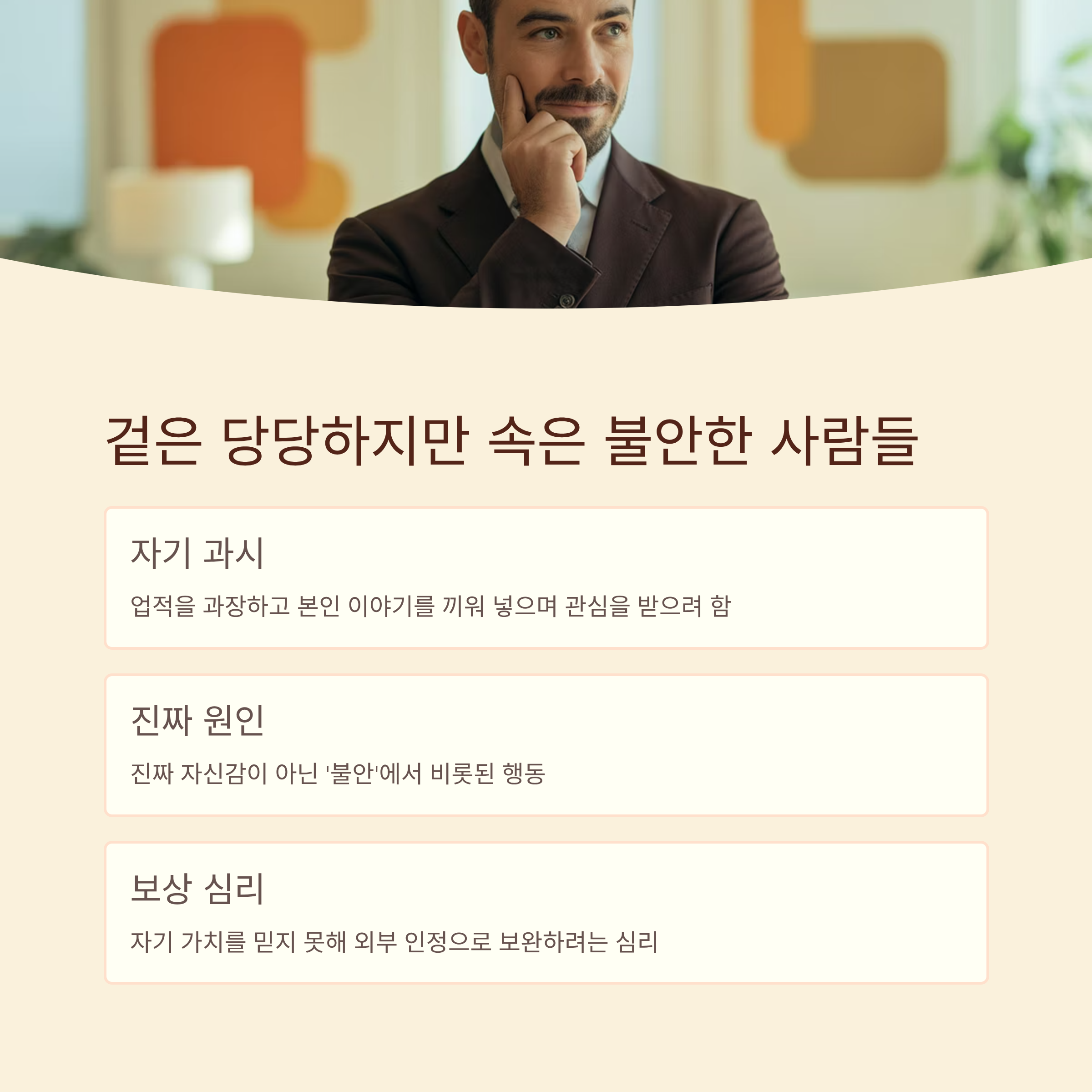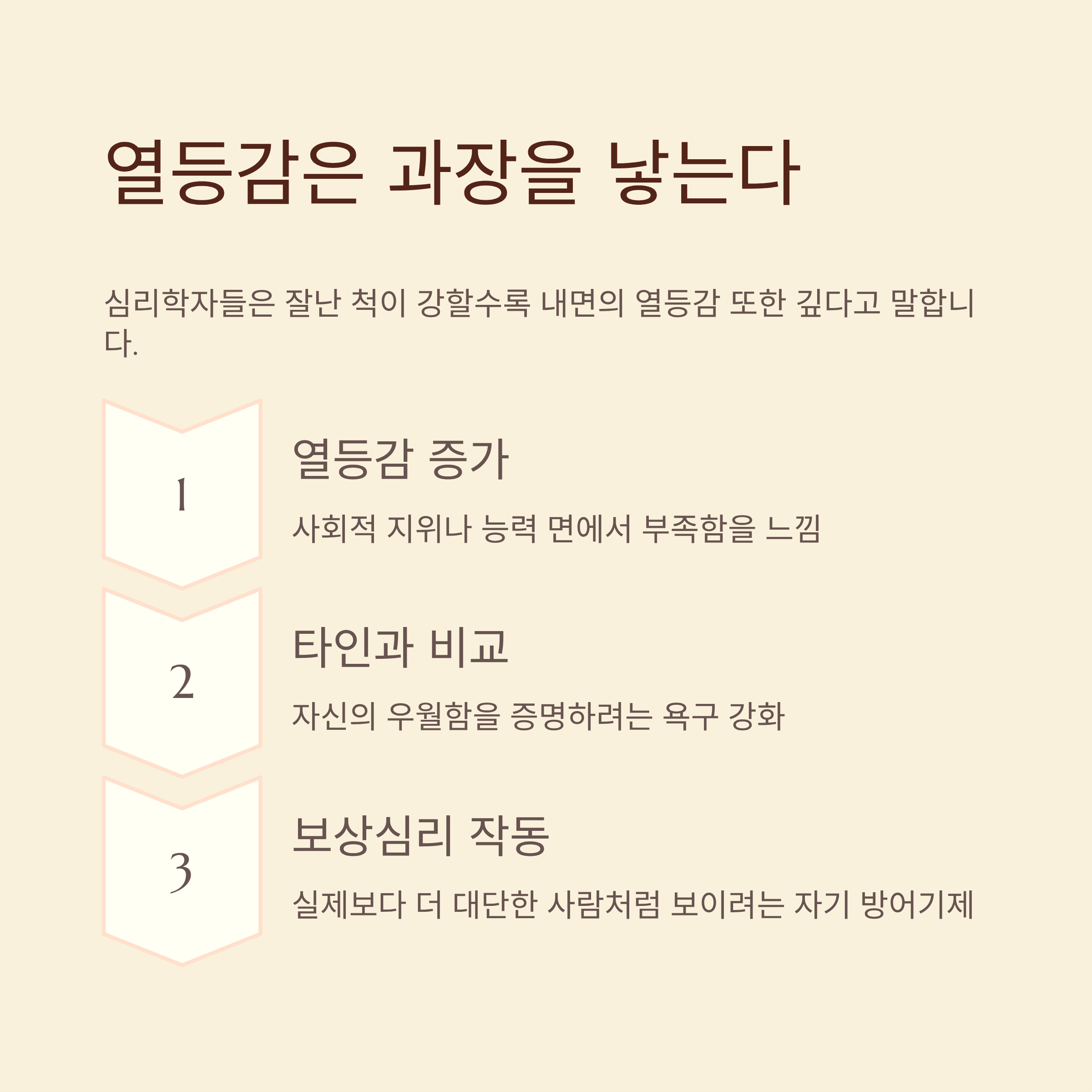 이런 행동은 실제보다 더 대단한 사람처럼 보이려는 ‘보상심리’에서 비롯되며, 일종의 자기 방어기제입니다.