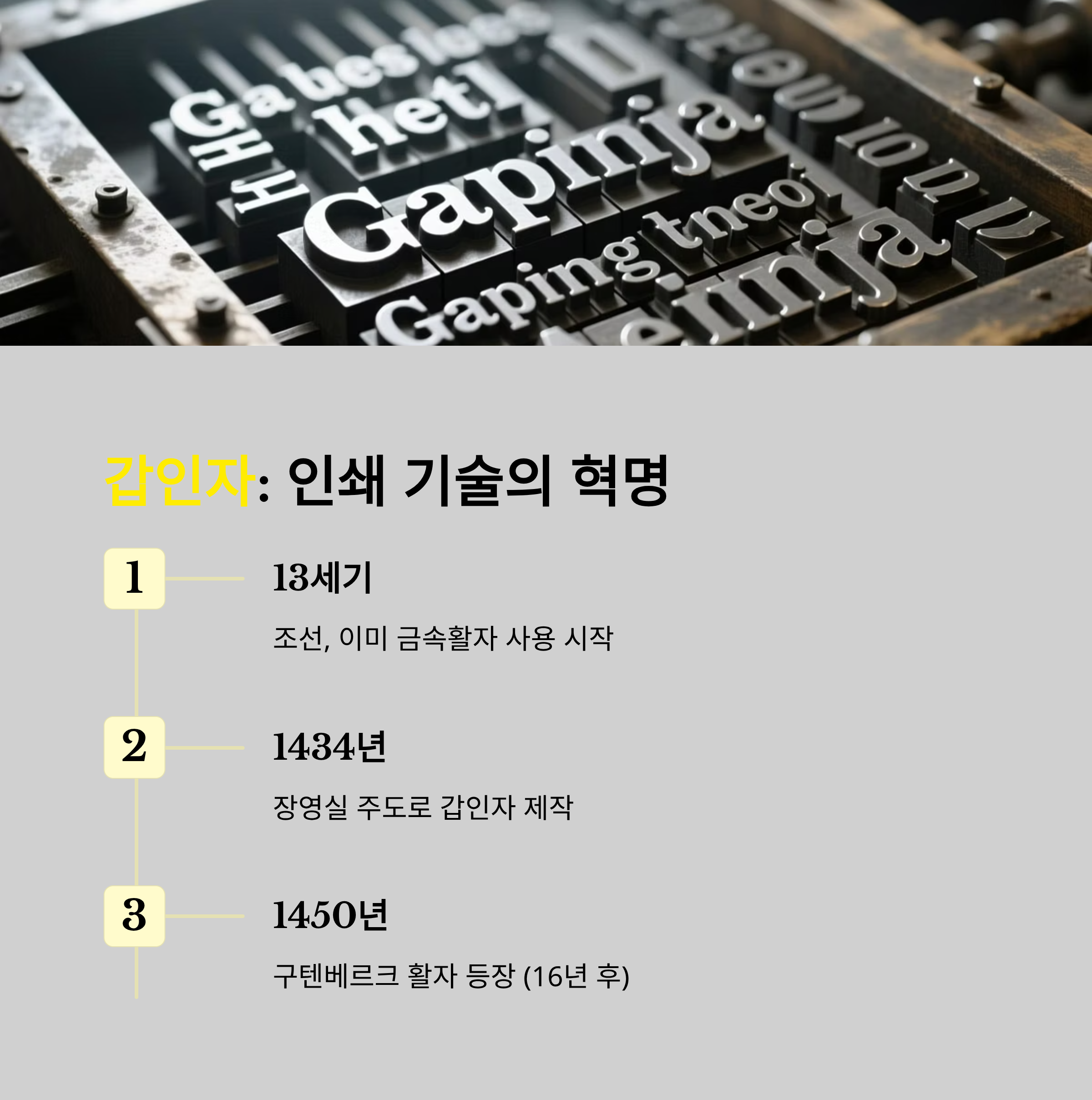 이미 13세기부터 금속활자를 사용해왔으며, 갑인자는 그 정점이라 할 수 있습니다.
