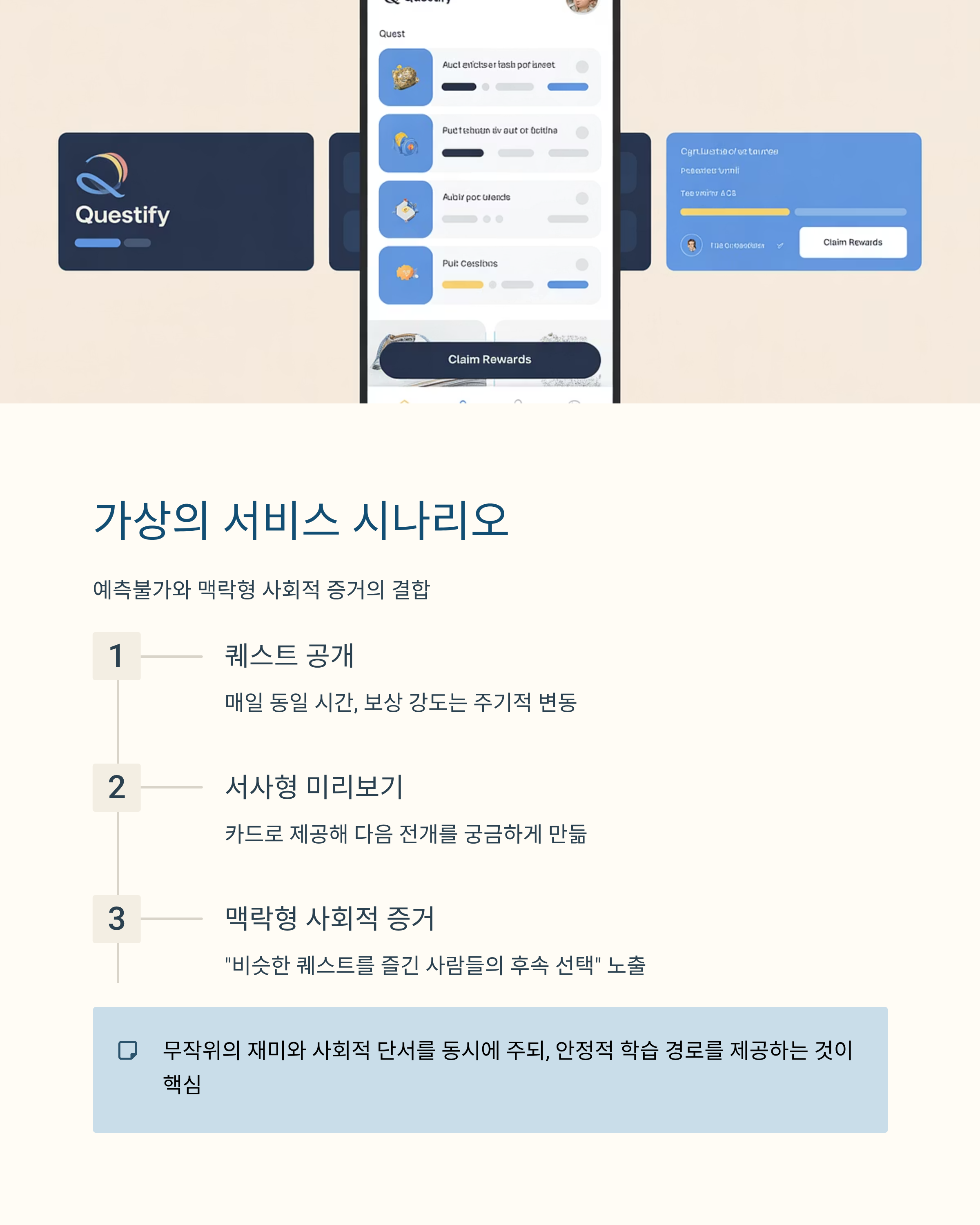 신규 퀘스트를 매일 동일한 시간에 공개하되, 보상 강도는 주기적으로 변동시키는 방식을 생각해봅니다. 미리보기는 서사형 카드로 제공해 다음 전개를 궁금하게 만들고, 완료 화면에는 “비슷한 퀘스트를 즐긴 사람들의 후속 선택”을 맥락과 함께 노출합니다. 여기서 핵심은 무작위의 재미와 사회적 단서를 동시에 주되, 과도한 자극 없이 안정적 학습 경로를 제공하는 것입니다. 사용자는 예측불가의 작은 설렘과 집단적 참여감 사이에서 계속 돌아오게 됩니다.