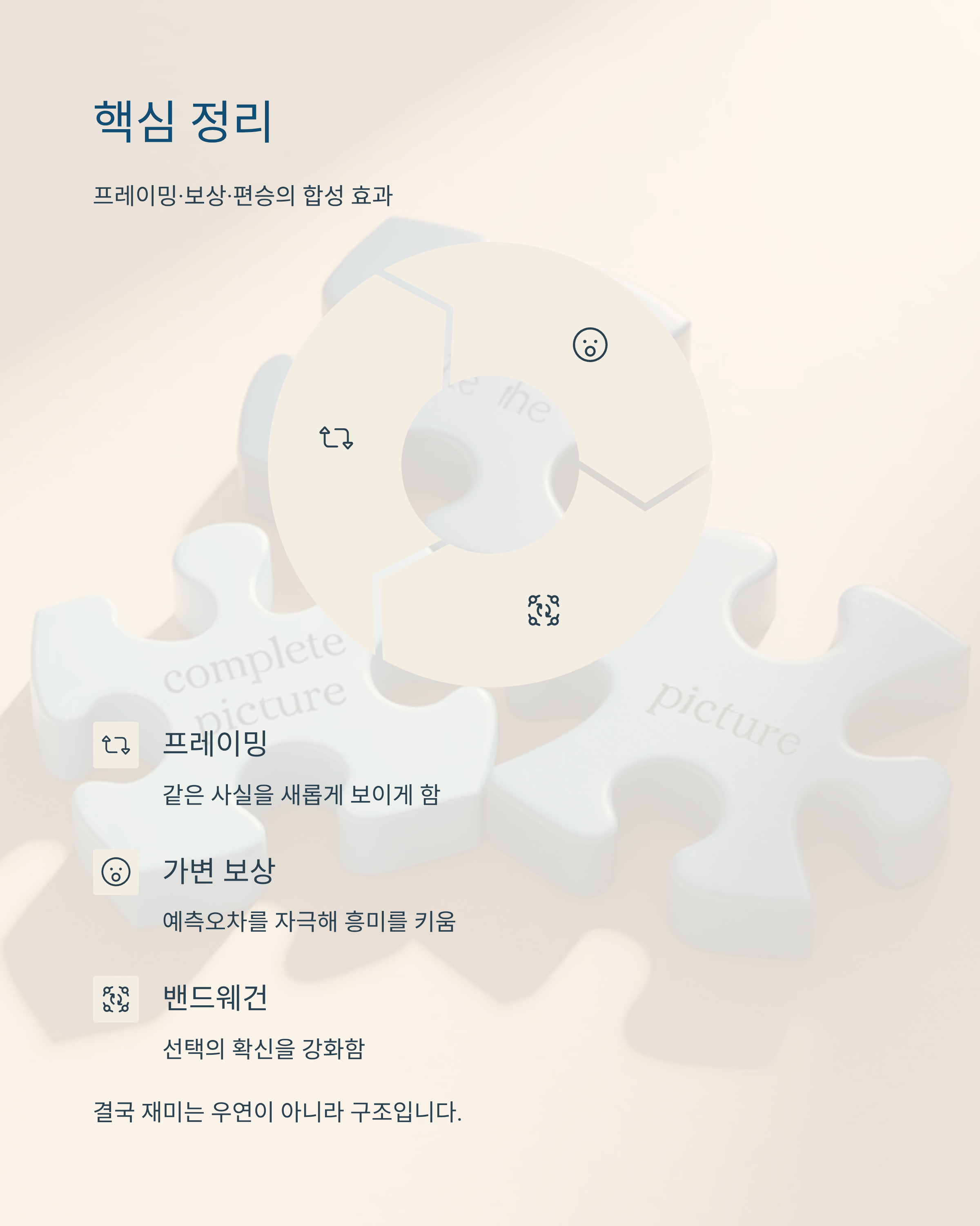 프레이밍은 같은 사실을 새롭게 보이게 하고, 가변 보상은 예측오차를 자극해 흥미를 키우며, 밴드웨건은 선택의 확신을 강화합니다. 세 요소의 교차점에서 “왜 이렇게 재미있지”가 탄생합니다. 설계자는 표현 방식을 정교화하고, 보상 변동성을 균형 있게 조절하며, 사회적 단서를 맥락화하여 안전하게 확장해야 합니다. 결국 재미는 우연이 아니라 구조입니다.