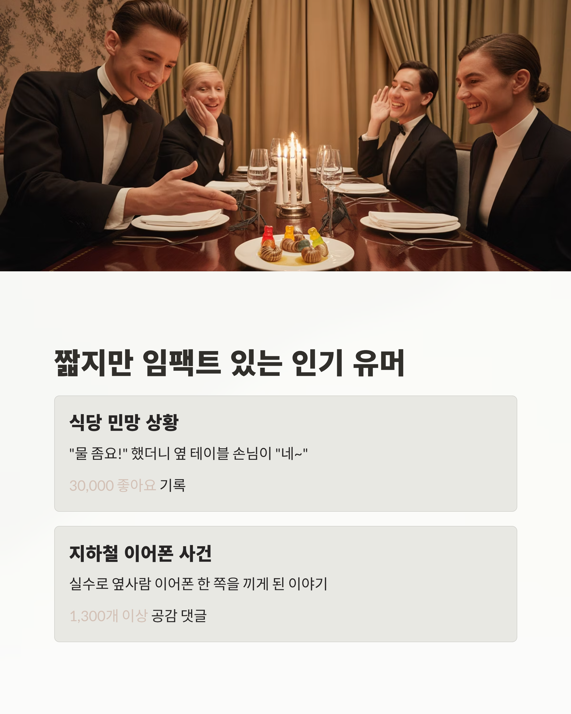 2025년 상반기, 온라인 커뮤니티와 SNS를 강타한 유머 트렌드는 ‘짧고 공감가는 한방 웃음’입니다.