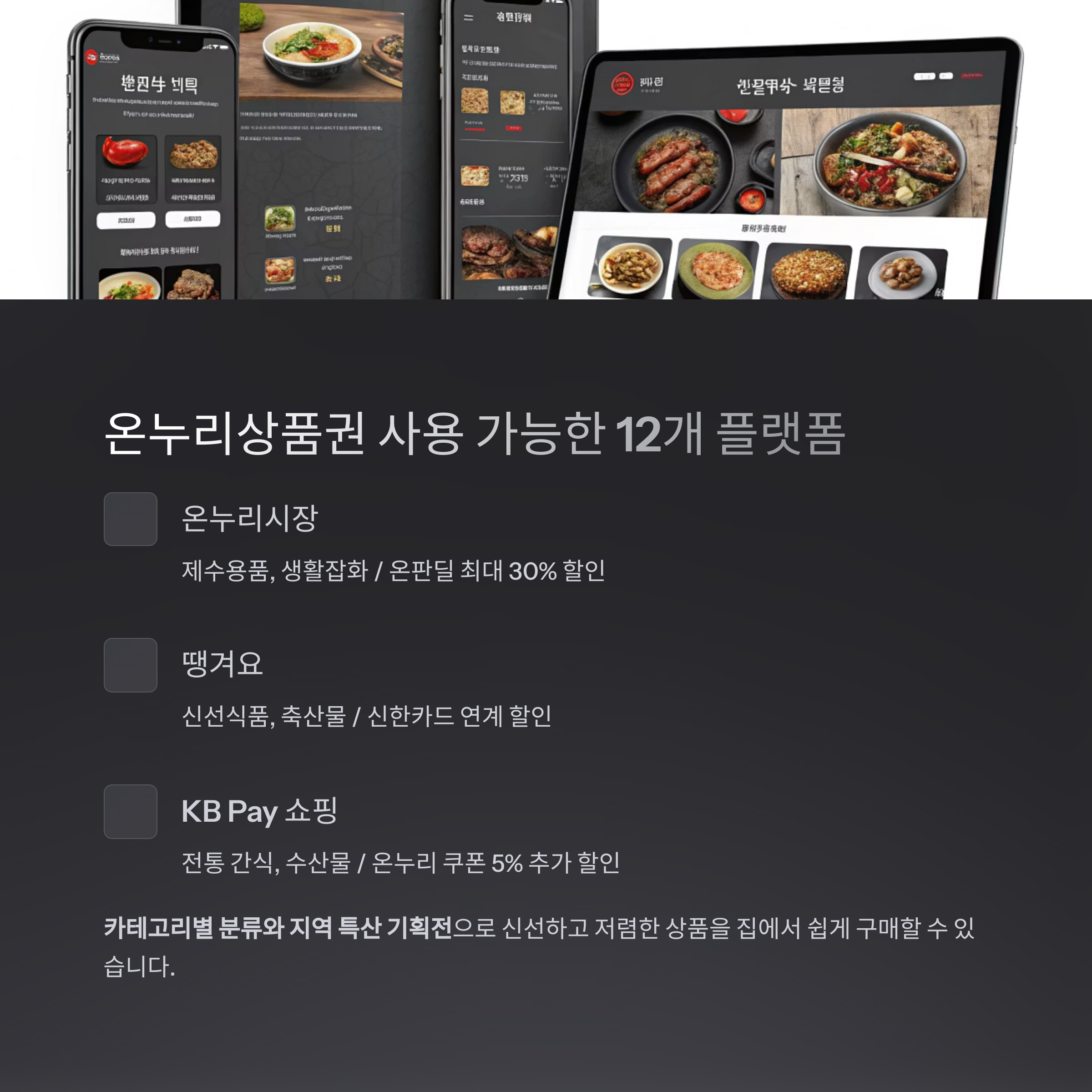 각 플랫폼에서는 카테고리별 분류와 지역 특산 기획전이 함께 운영되고 있어