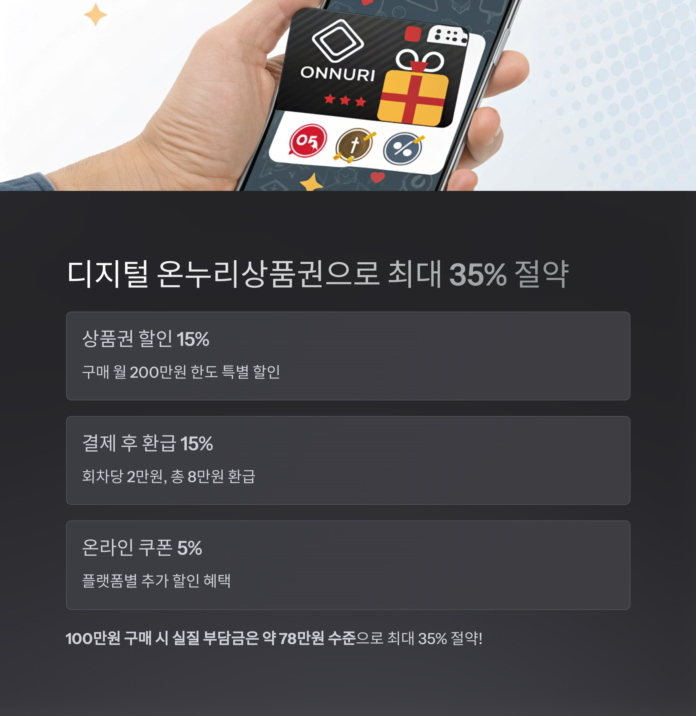 | 디지털 상품권 할인 | 15% 특별 할인 구매 | 월 200만원 한도 |