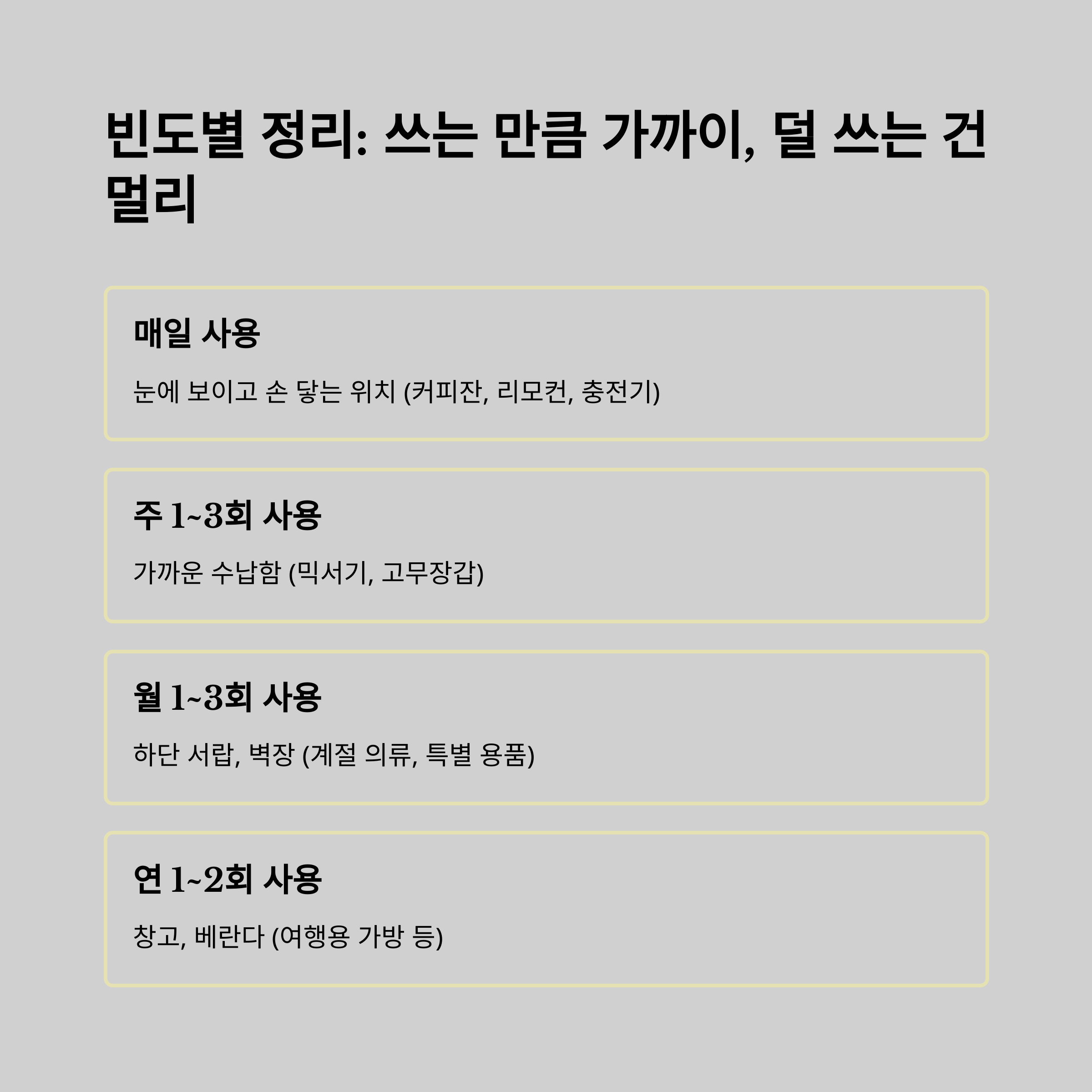 빈도별 정리: 쓰는 만큼 가까이, 덜 쓰는 건 멀리