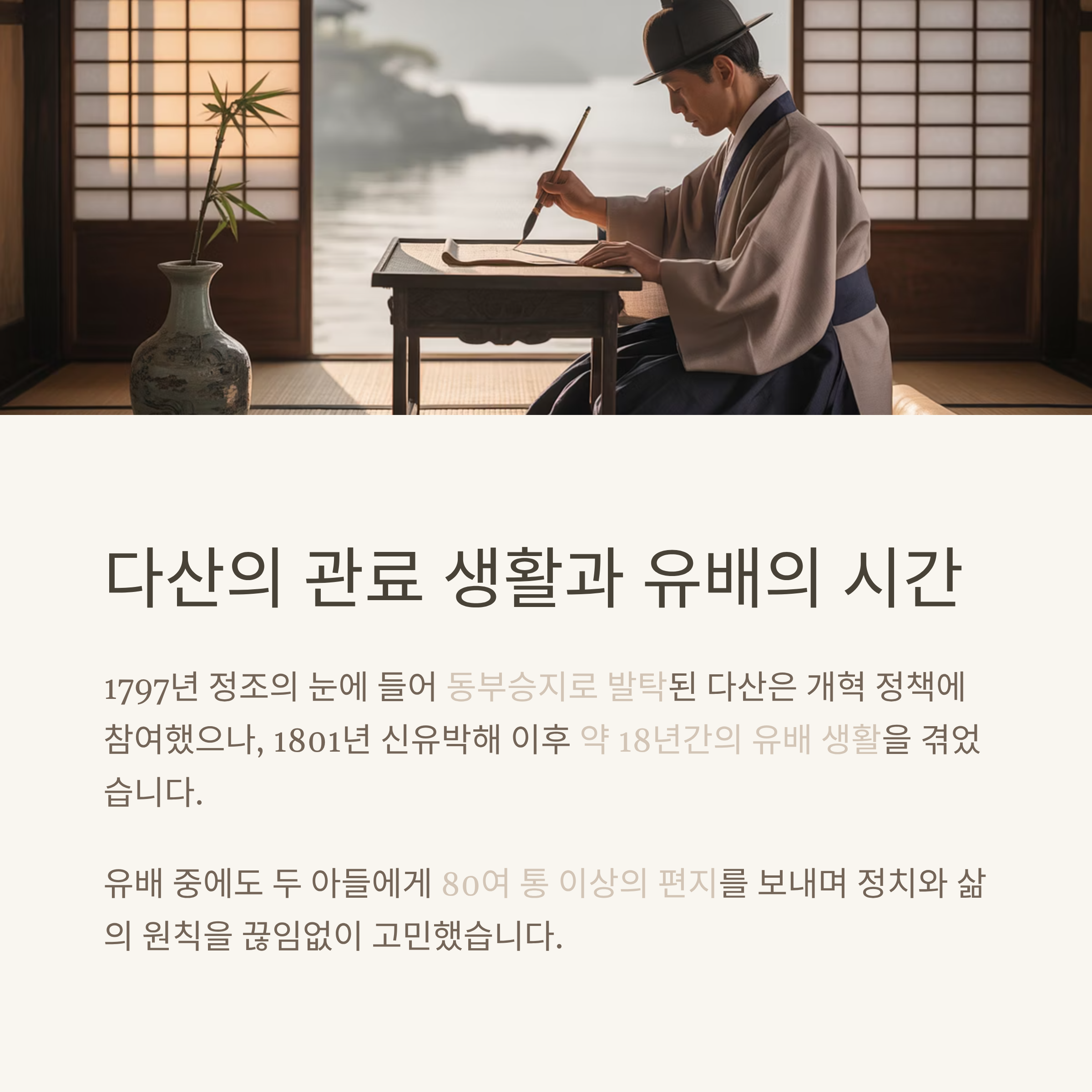 1797년 정조의 눈에 들어 동부승지로 발탁된 다산은 관료로서 개혁 정책에 참여했습니다. 그러나 1801년 신유박해 이후 약 18년간 유배 생활을 하며 제도 개혁의 꿈을 잠시 멈추어야 했습니다. 그럼에도 그는 두 아들에게 보낸 80여 통 이상의 편지에서 정치와 삶의 원칙을 끊임없이 고민했습니다.