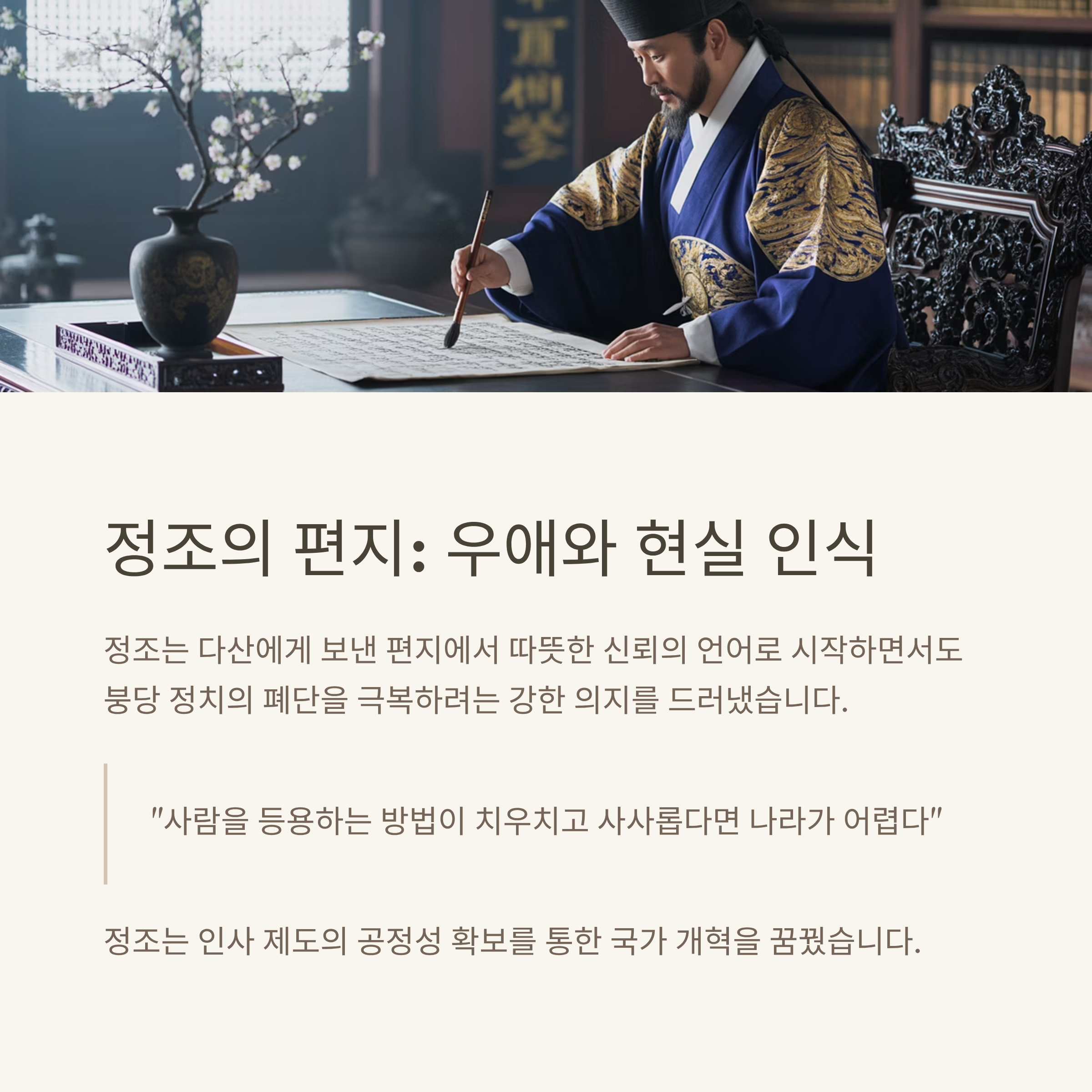 정조가 다산에게 보낸 편지는 따뜻한 신뢰의 언어로 시작하지만, 그 속에는 붕당 정치의 폐단을 극복하고자 하는 강한 의지가 담겨 있습니다. 그는 "사람을 등용하는 방법이 치우치고 사사롭다면 나라가 어렵다"는 점을 강조하며, 인사 제도의 공정성을 확보하려 했습니다.
