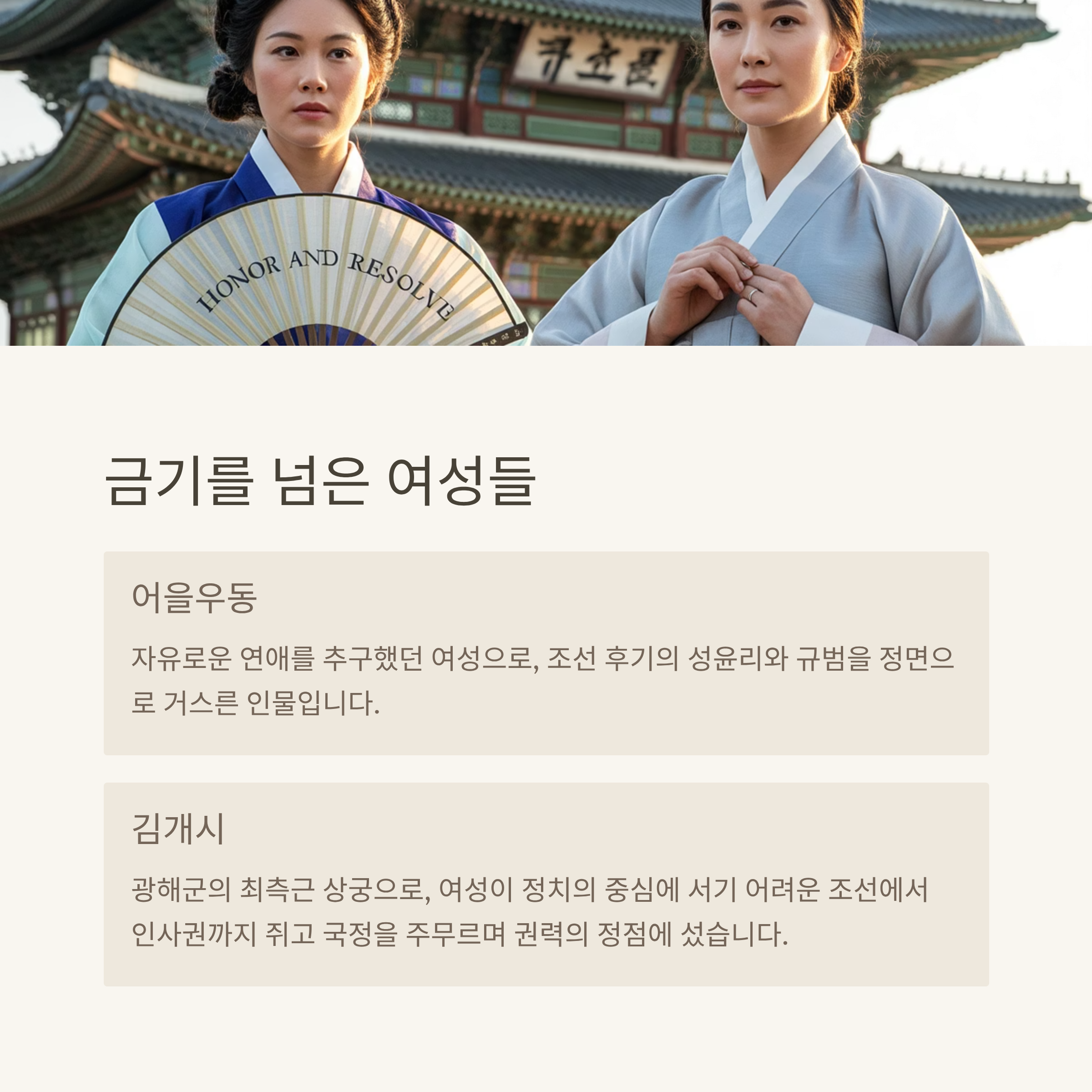 반면 김개시는 광해군의 최측근으로서 정사를 움직였던 실세 상궁이었습니다. 여성이 정치의 중심에 서기 어려운 조선에서 그녀는 인사권까지 쥐고 국정을 주무르며 권력의 정점에 섰습니다. 물론 권력 남용과 농단의 책임도 그녀의 몫이었죠.