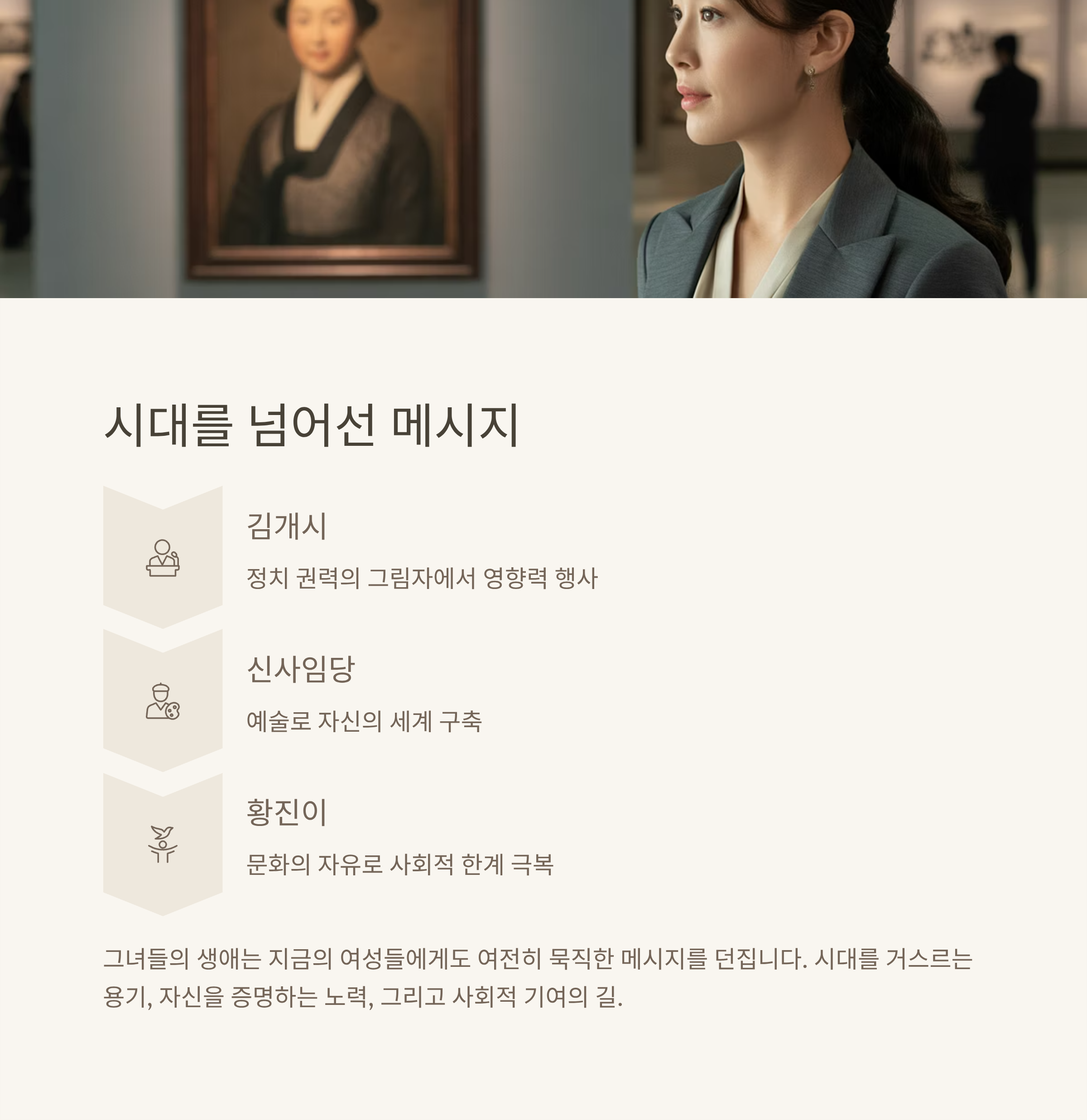 이 여성들의 삶은 단순한 개인의 성공 이야기가 아닙니다. 김개시는 정치 권력의 그림자에서, 신사임당은 예술로, 황진이는 문화의 자유로, 허난설헌은 시문으로, 김만덕은 경제와 자선으로 조선 사회에 흔적을 남겼습니다.