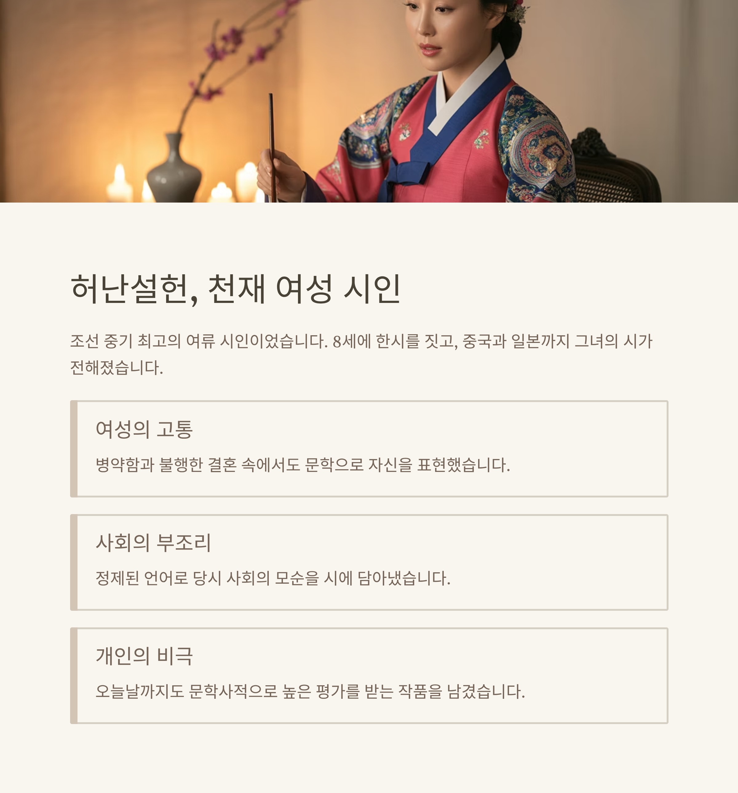 | 허난설헌 | 시문학 | 조선 최초의 여성 시인 |