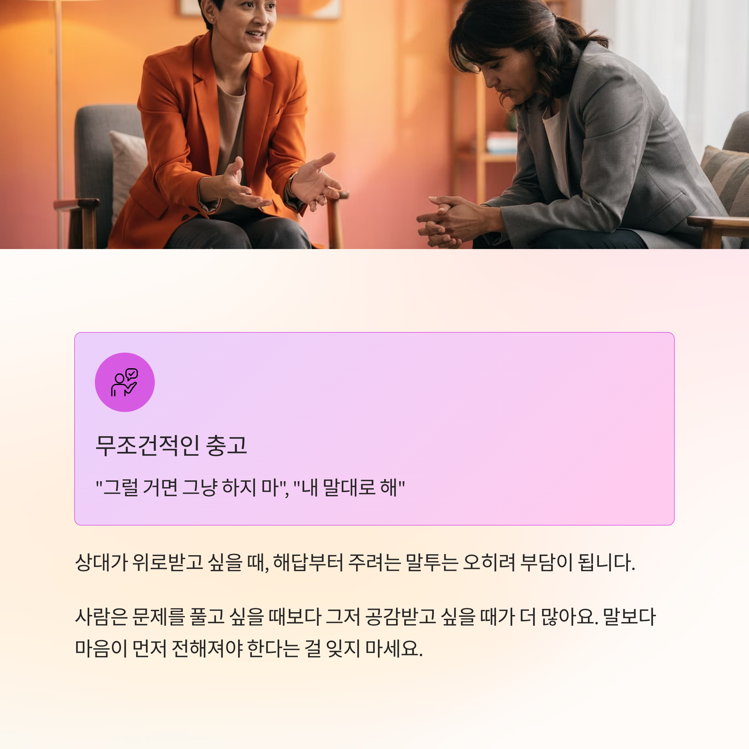 상대가 위로받고 싶을 때, 해답부터 주려는 말투는 오히려 부담이 됩니다.