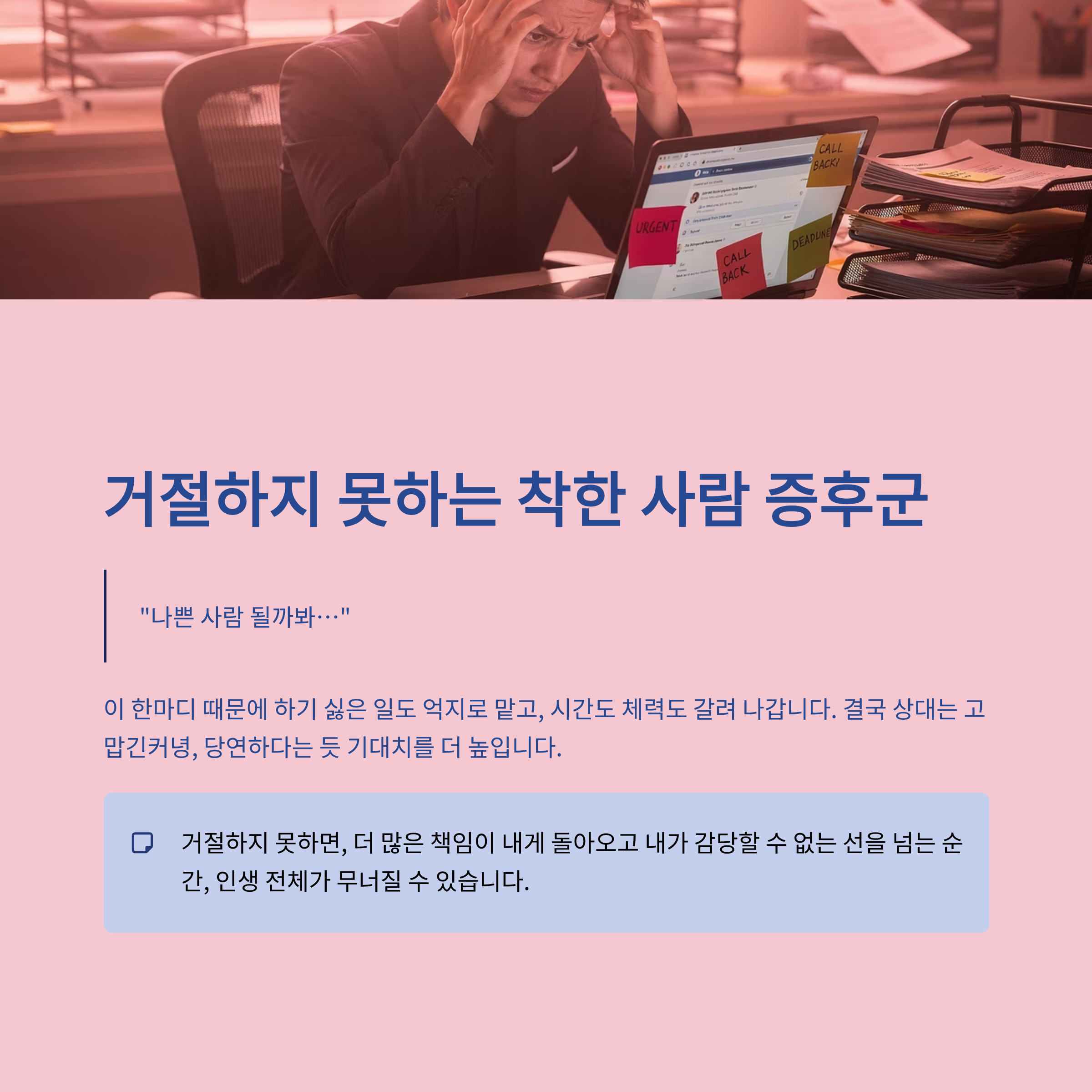 이 한마디 때문에 하기 싫은 일도 억지로 맡고, 시간도 체력도 갈려 나갑니다.