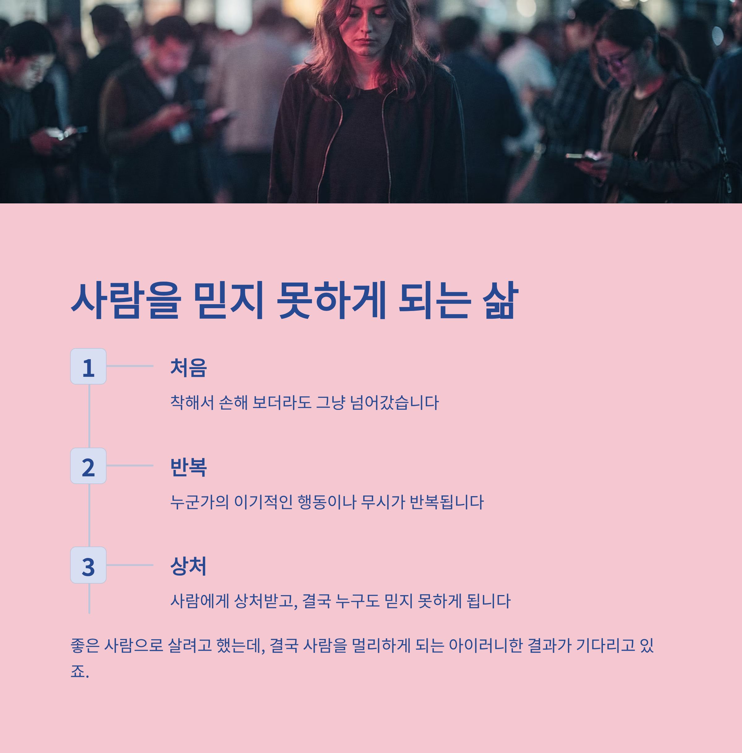 사람에게 지치고, 나중엔 아무도 믿지 못하게 되는 삶