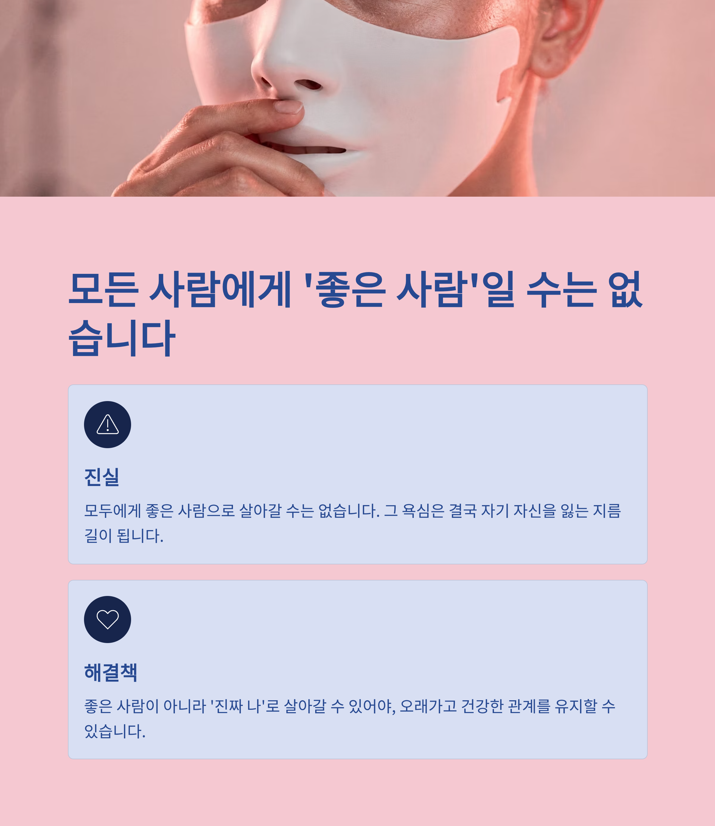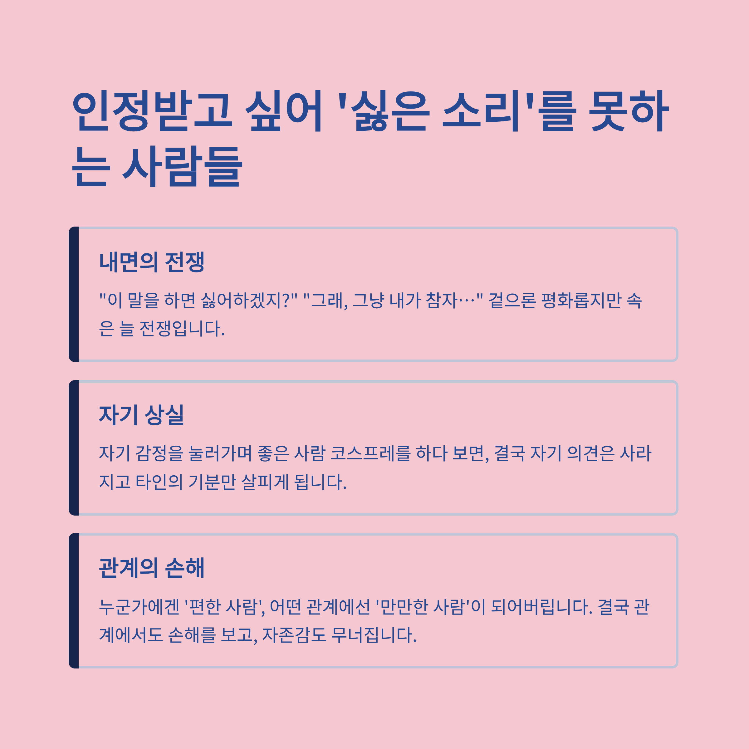자기 감정을 눌러가며 ‘좋은 사람’ 코스프레를 하다 보면, 결국 자기 의견은 사라지고 타인의 기분만 살피게 됩니다. 그 결과, 누군가에겐 ‘편한 사람’, 어떤 관계에선 ‘만만한 사람’이 되어버리죠.