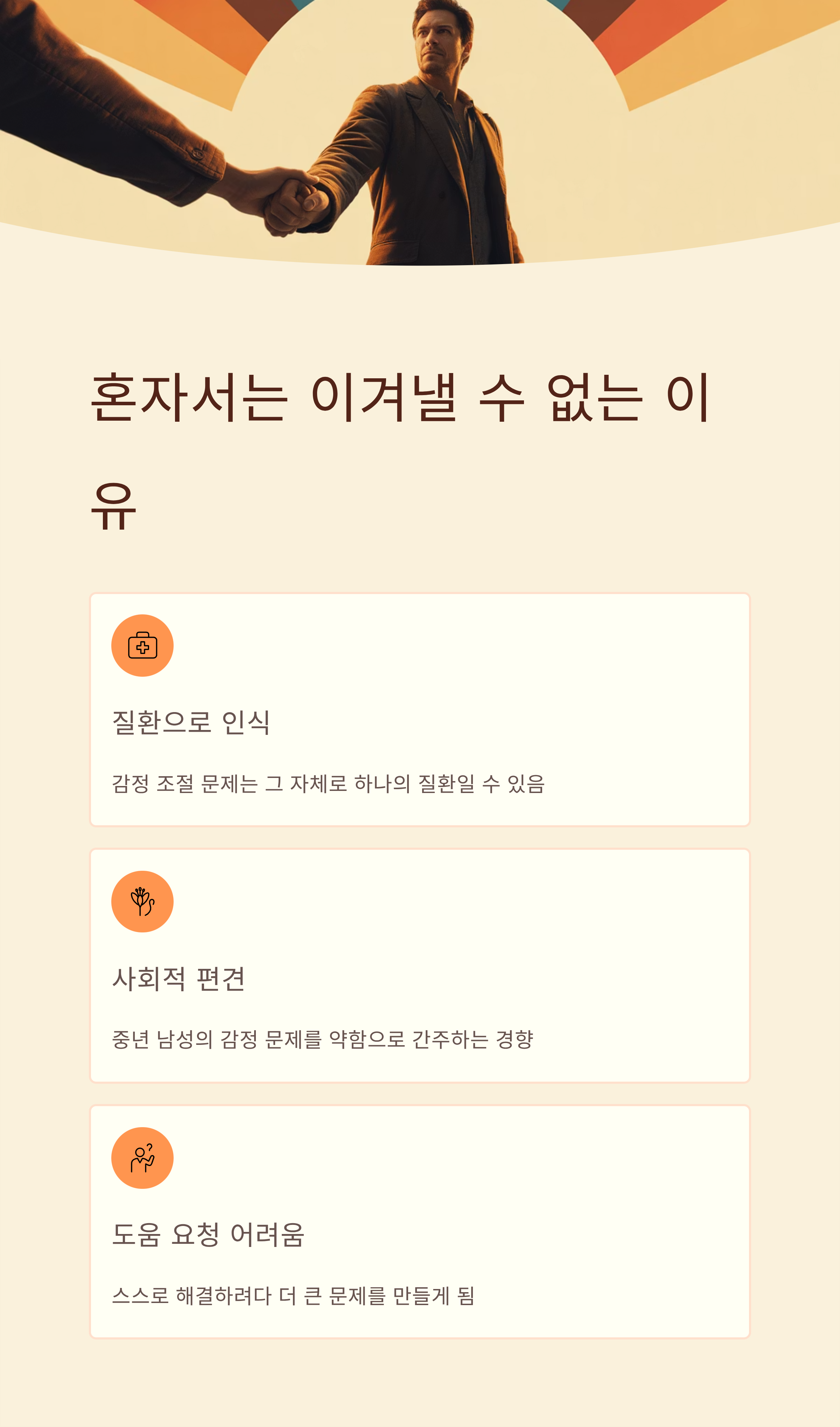 감정 조절 문제는 그 자체로 하나의 질환일 수 있습니다. 하지만 우리 사회는 여전히 중년 남성의 감정 문제를 약함으로 간주하는 경향이 강하죠. 그로 인해 대부분은 도움을 요청하지 않고, 스스로 해결하려다 더 큰 문제를 만들게 됩니다.