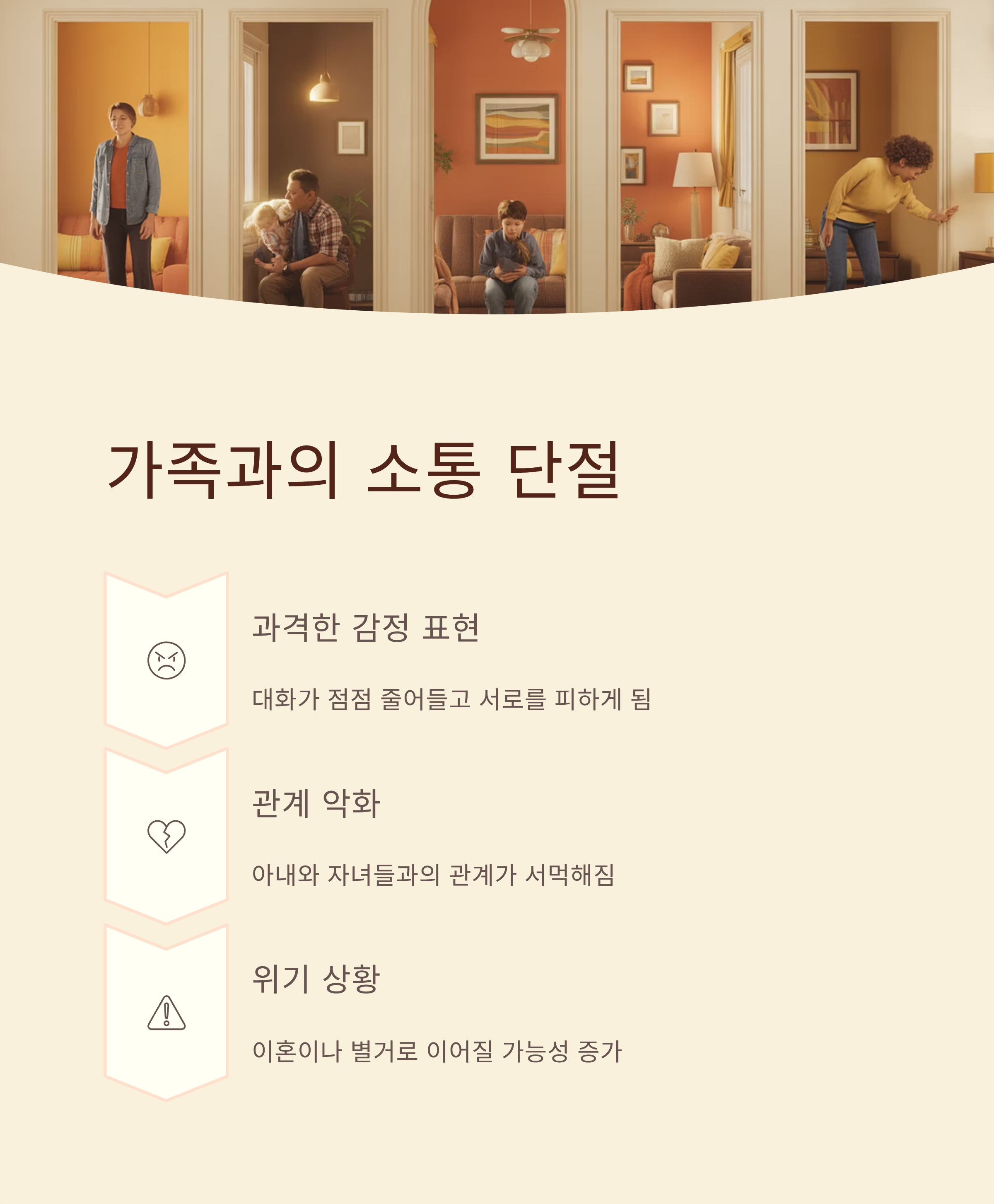 감정 표현이 과격해질수록 가족과의 대화는 줄어들 수밖에 없습니다. 특히 아내와 자녀들과의 관계가 서먹해지고, 서로를 피하게 되는 경우도 많습니다. 결국 가정 내 긴장감은 높아지고, 이혼이나 별거로 이어질 가능성도 생깁니다.