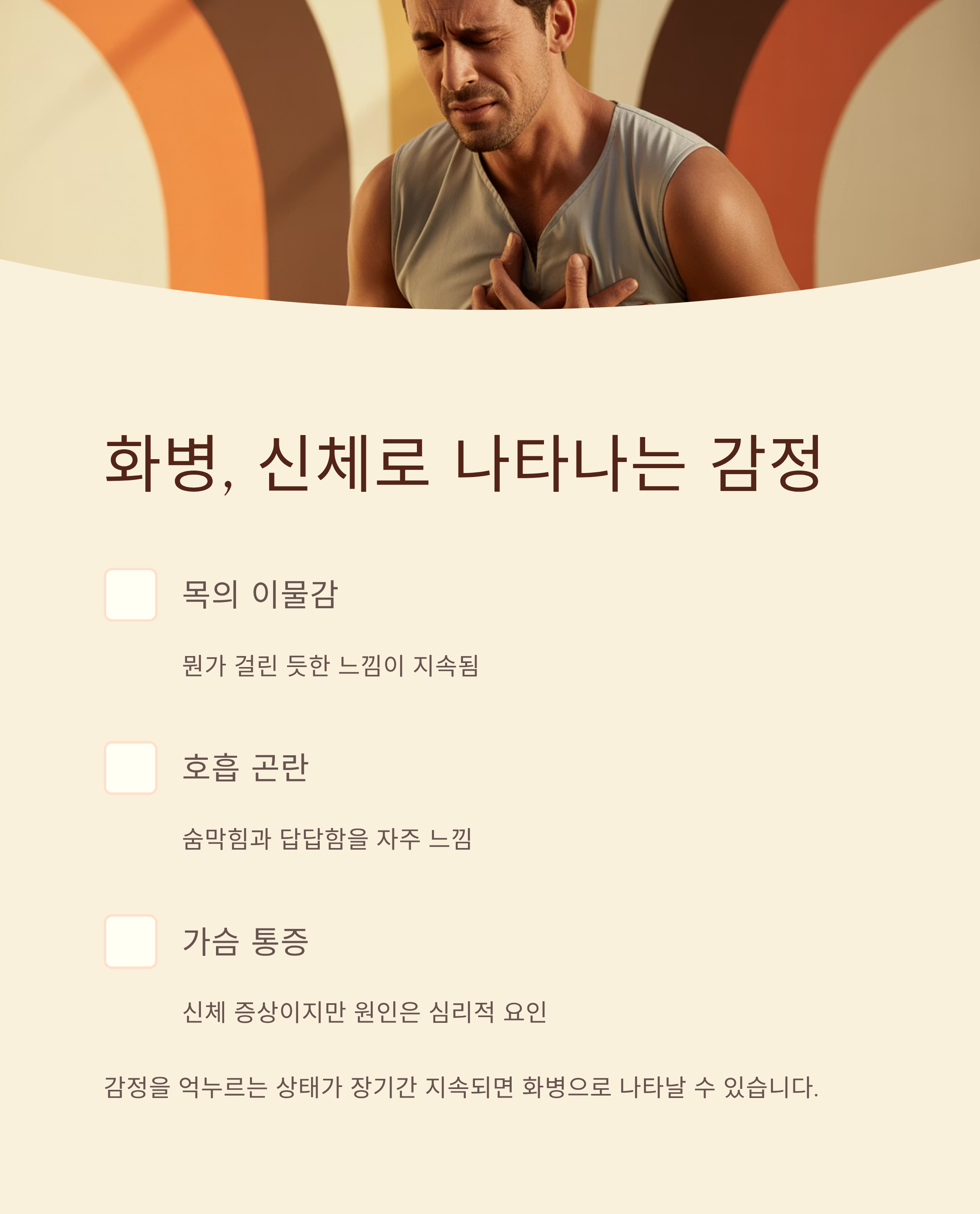 감정을 제대로 표현하지 못하고 억누르는 상태가 장기간 지속되면, 이른바 ‘화병’으로 나타날 수 있습니다. 목에 뭔가 걸린 듯한 느낌, 숨막힘, 가슴 통증 등 신체 증상으로 드러나지만, 실제 원인은 심리적 요인일 가능성이 큽니다.