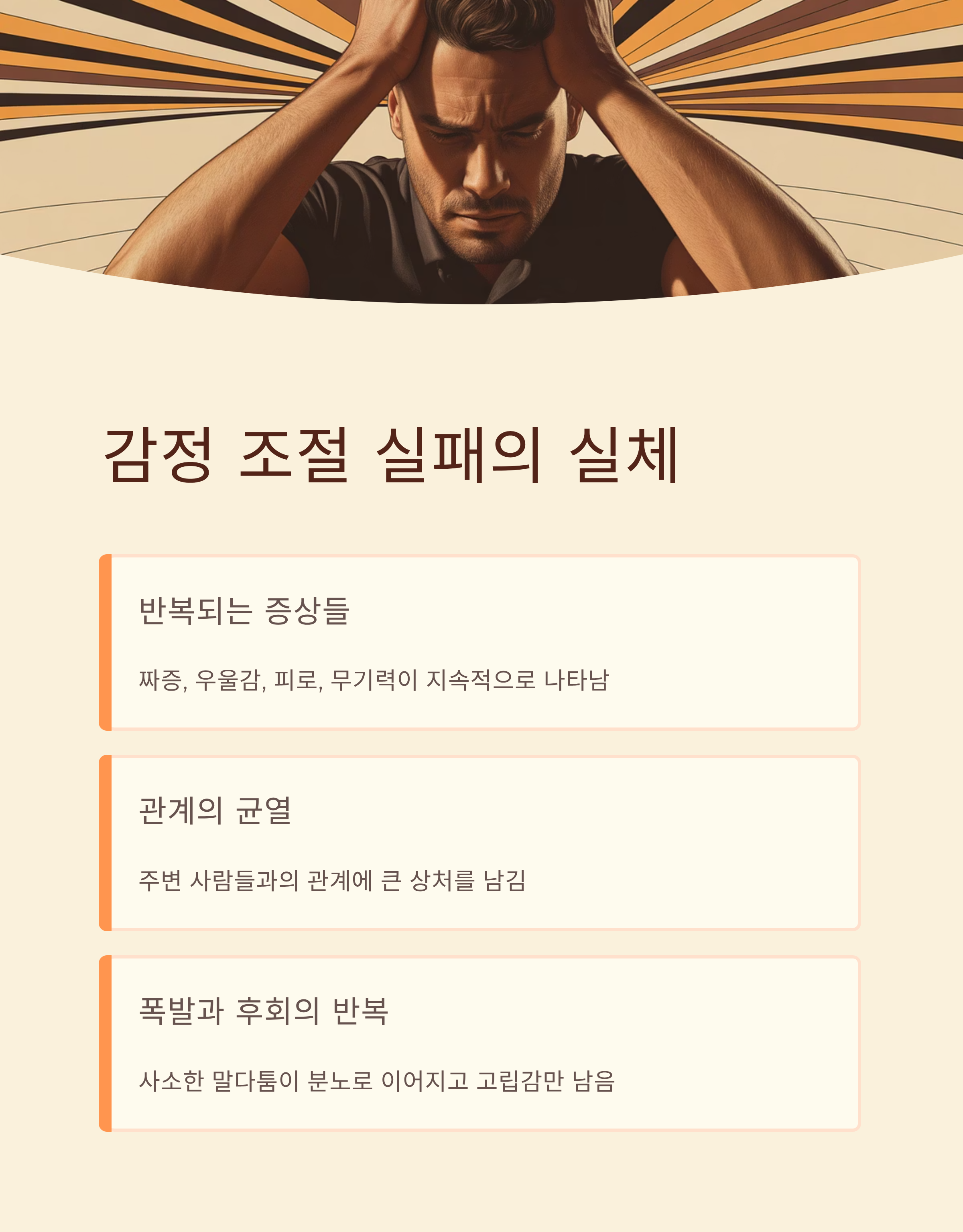중년의 감정 조절 실패는 단순한 기분 변화가 아닙니다. 짜증, 우울감, 피로, 무기력 같은 증상들이 반복되며 주변 사람들과의 관계에 큰 균열을 만들어냅니다.