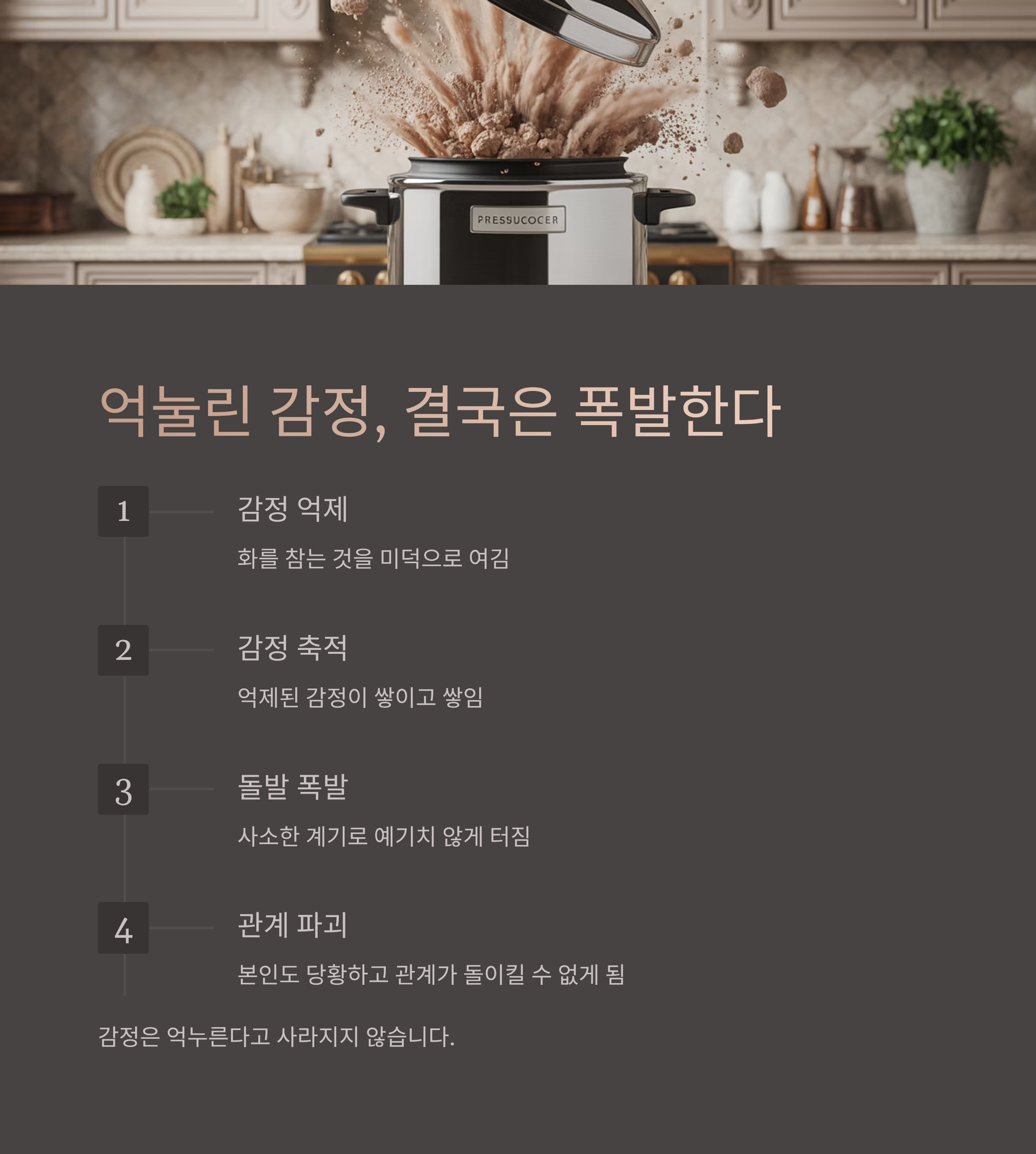 지속적으로 억제된 감정은 쌓이고 쌓이다가 예기치 않은 순간, 아주 사소한 계기로 폭발하게 됩니다.