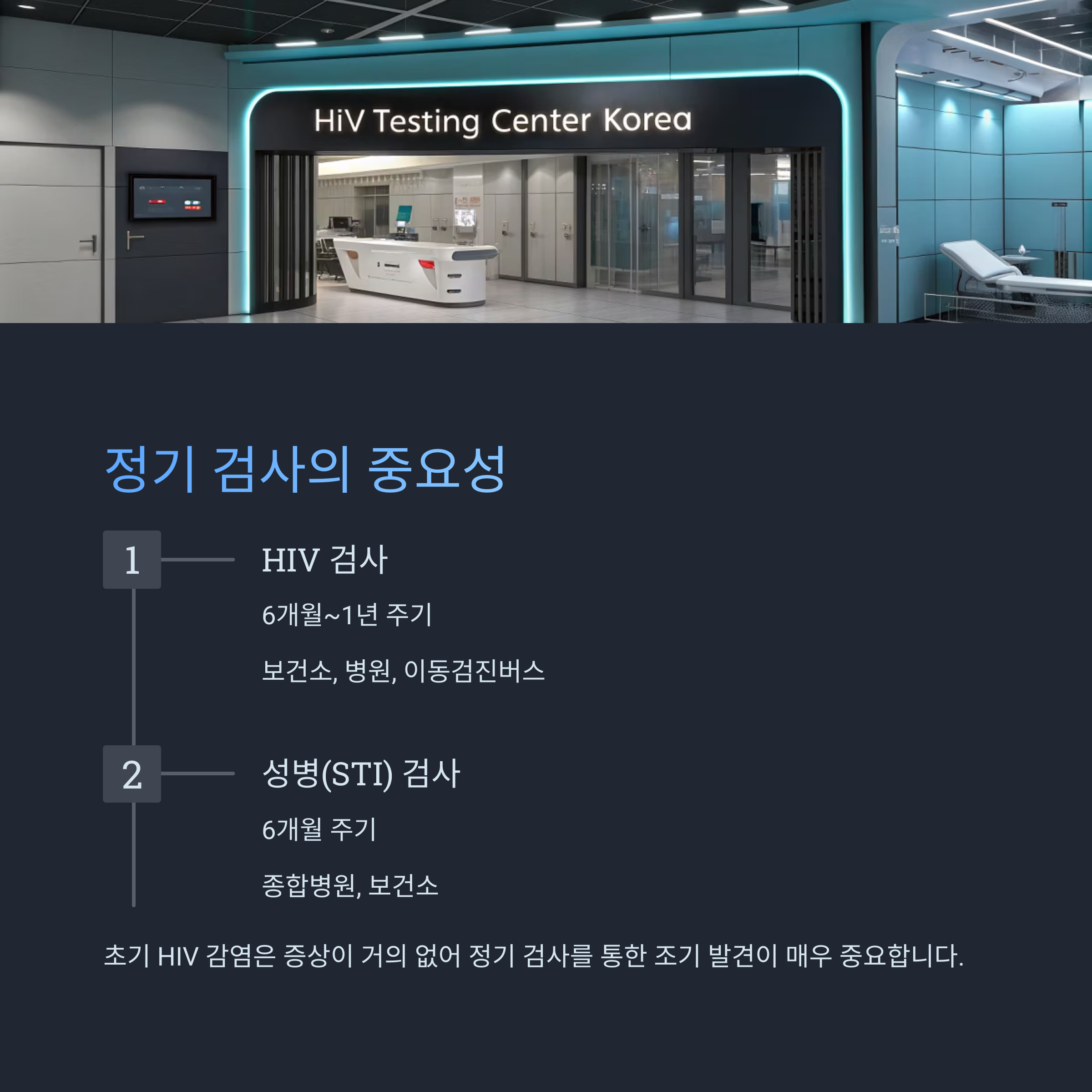 | HIV 검사 | 6개월~1년 | 보건소, 병원, 이동검진버스 |