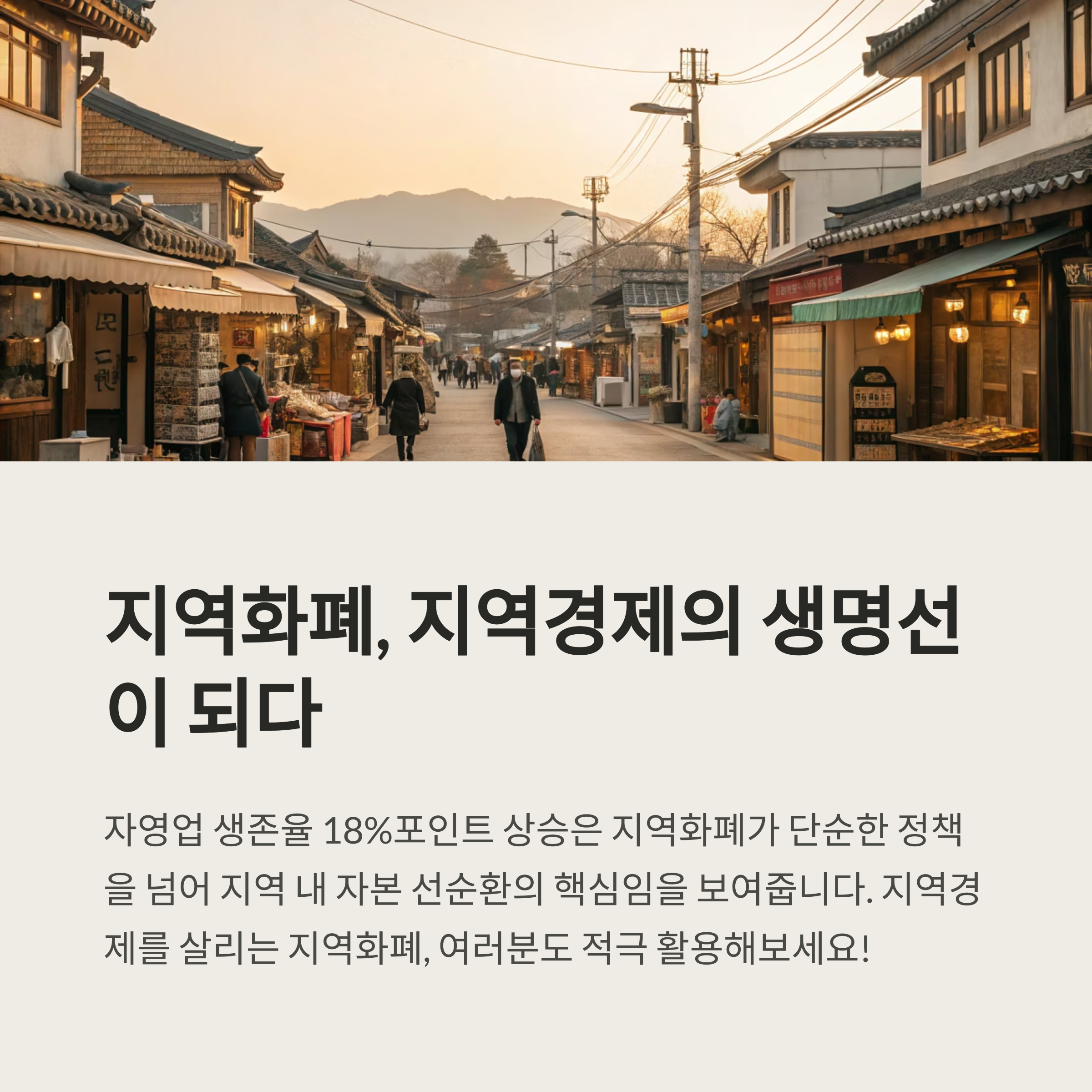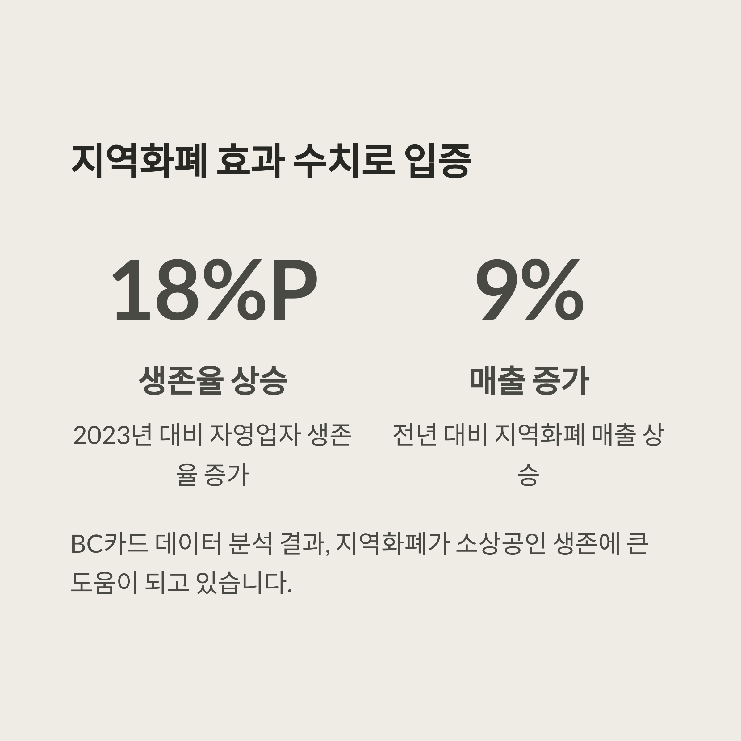 지역화폐를 이용한 소상공인의 생존율은 2023년 대비 2024년 18%포인트나 상승했습니다.