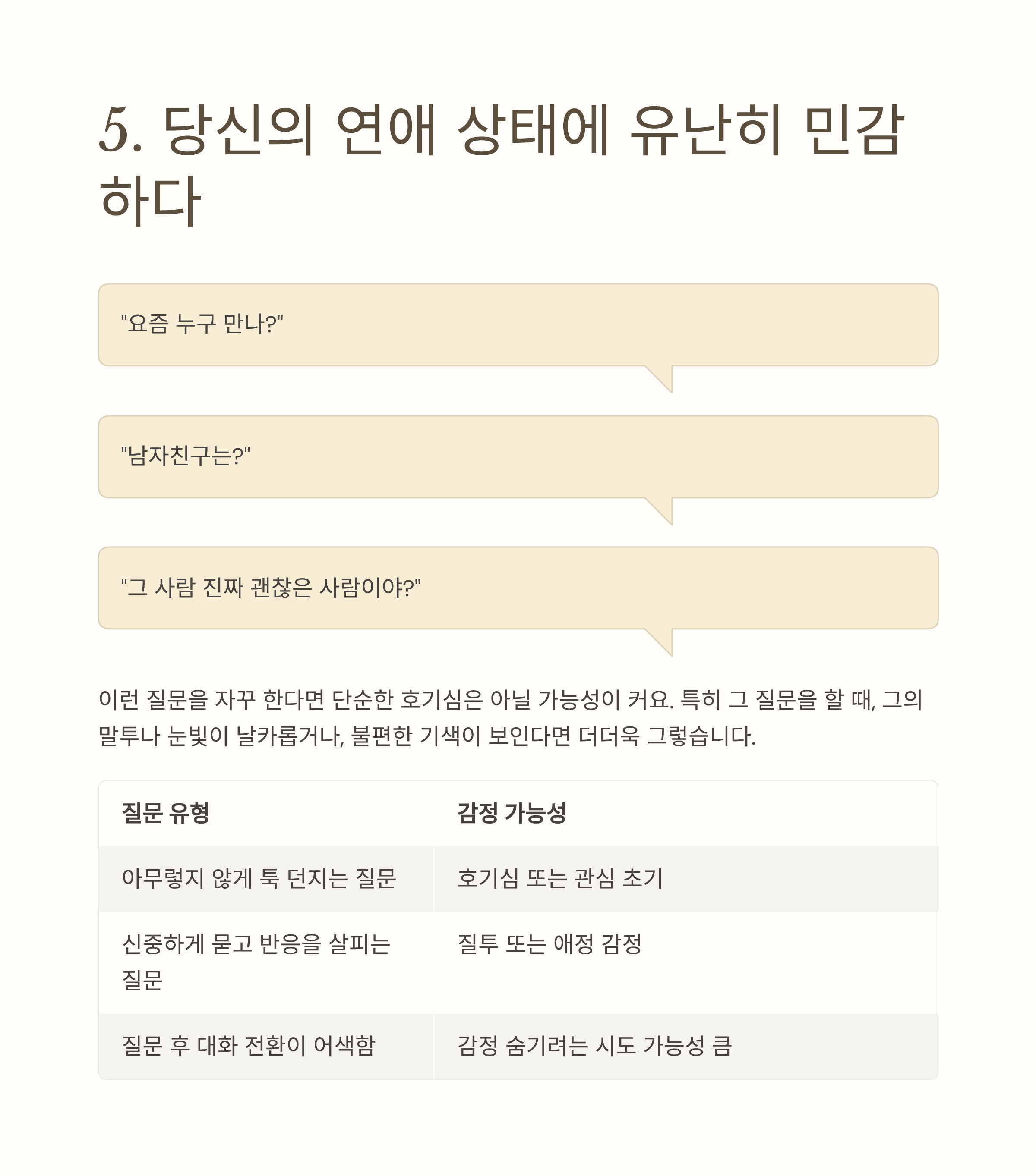 | 신중하게 묻고 반응을 살피는 질문 | 질투 또는 애정 감정 |