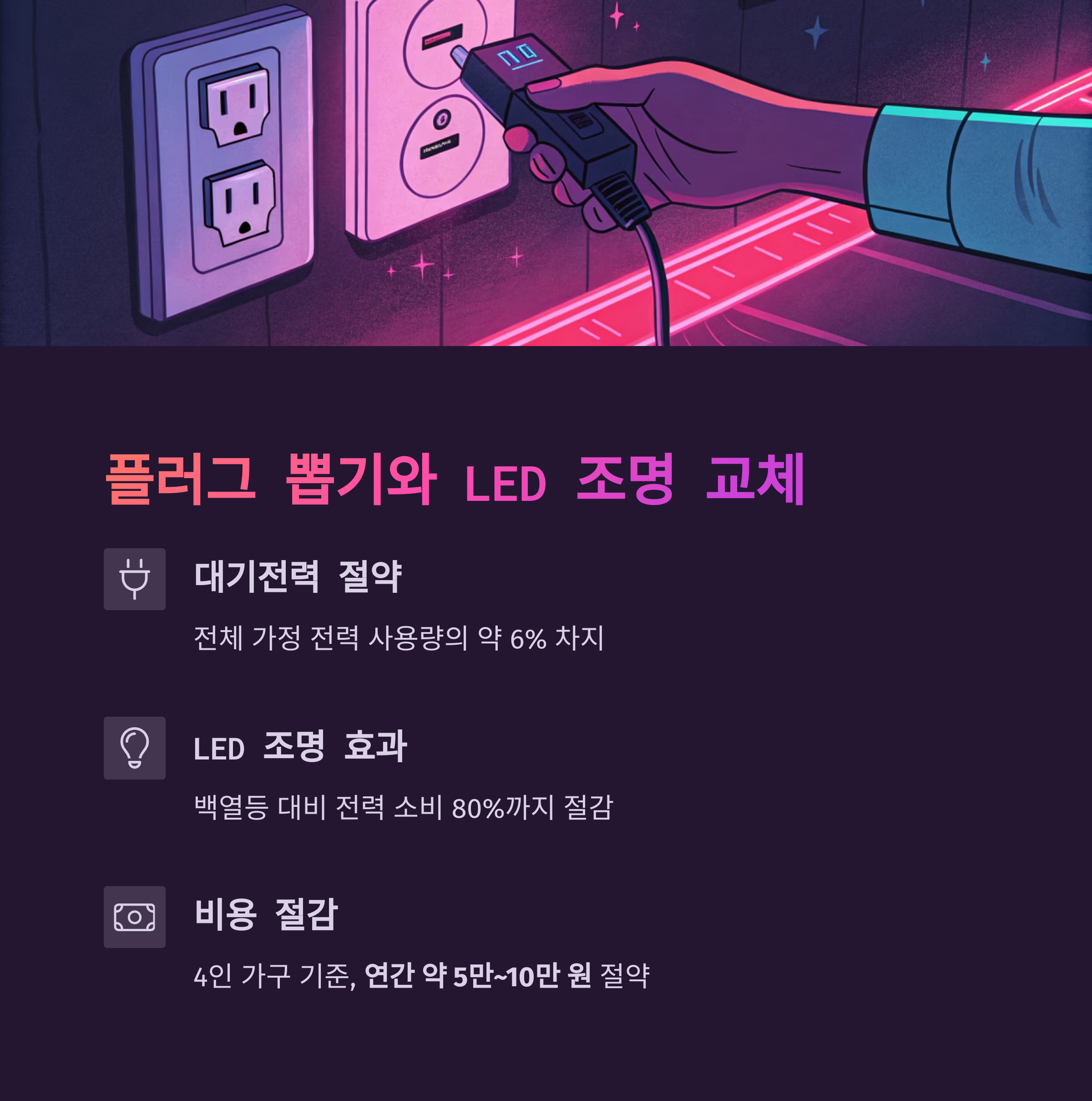 | 플러그 뽑기·LED | 연간 전력 6% 절감, 5만원에서 10만원 절약 | 에너지 효율 1등급 추천 |