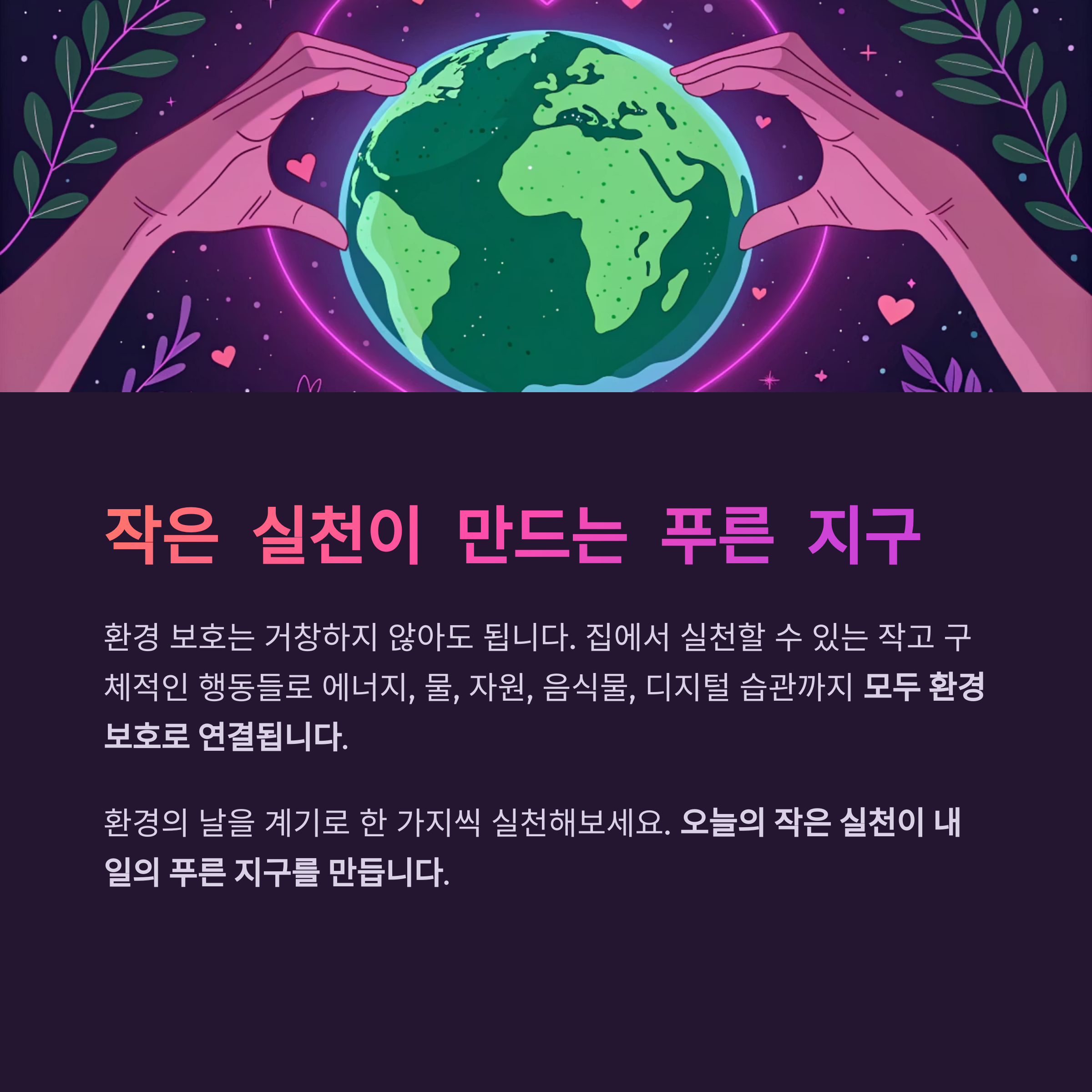 에너지, 물, 자원, 음식물, 디지털 습관까지 모두 환경 보호로 연결됩니다