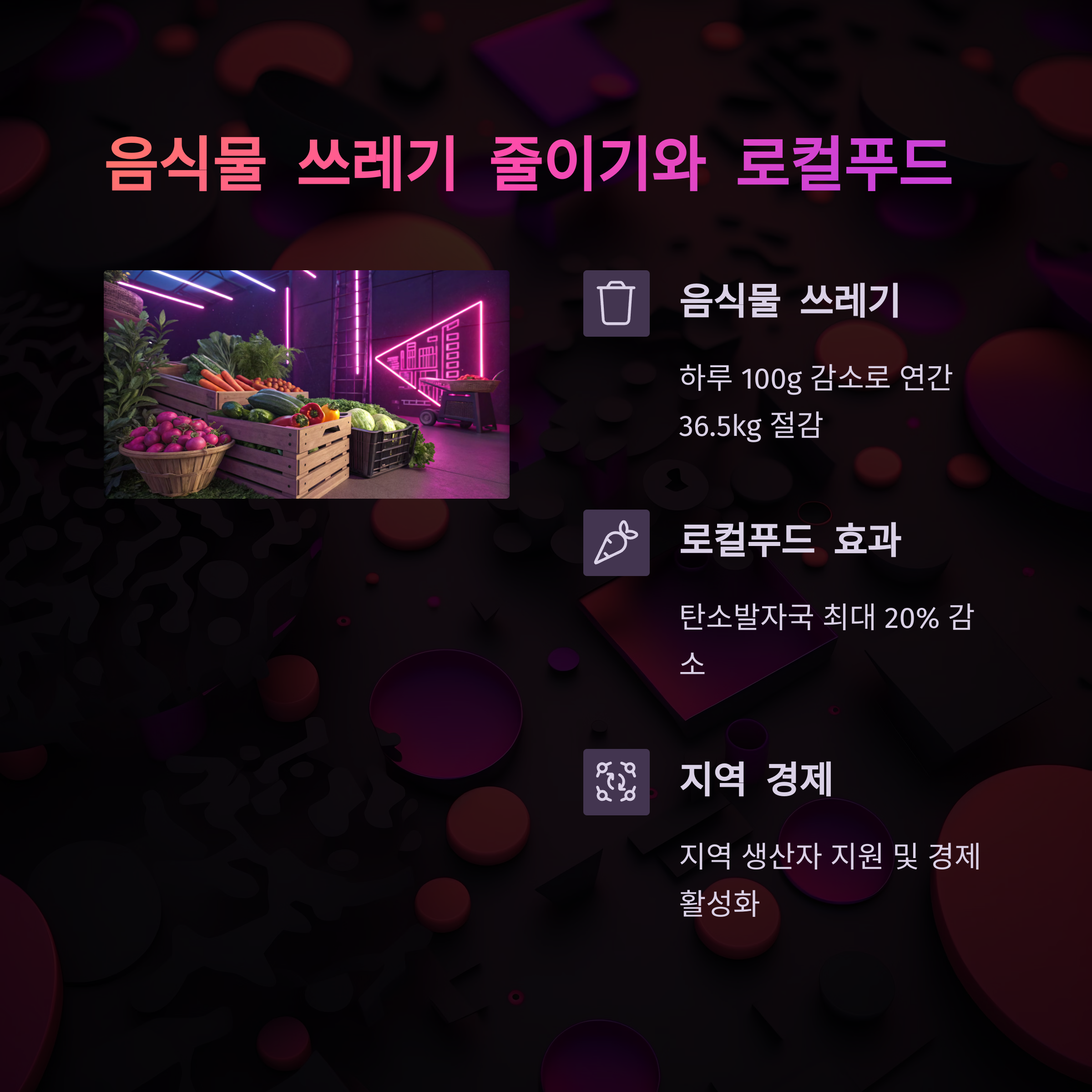 | 음식물 쓰레기 줄이기 | 연간 36.5kg 쓰레기 감축 | 로컬푸드 탄소발자국 20% 감소 |