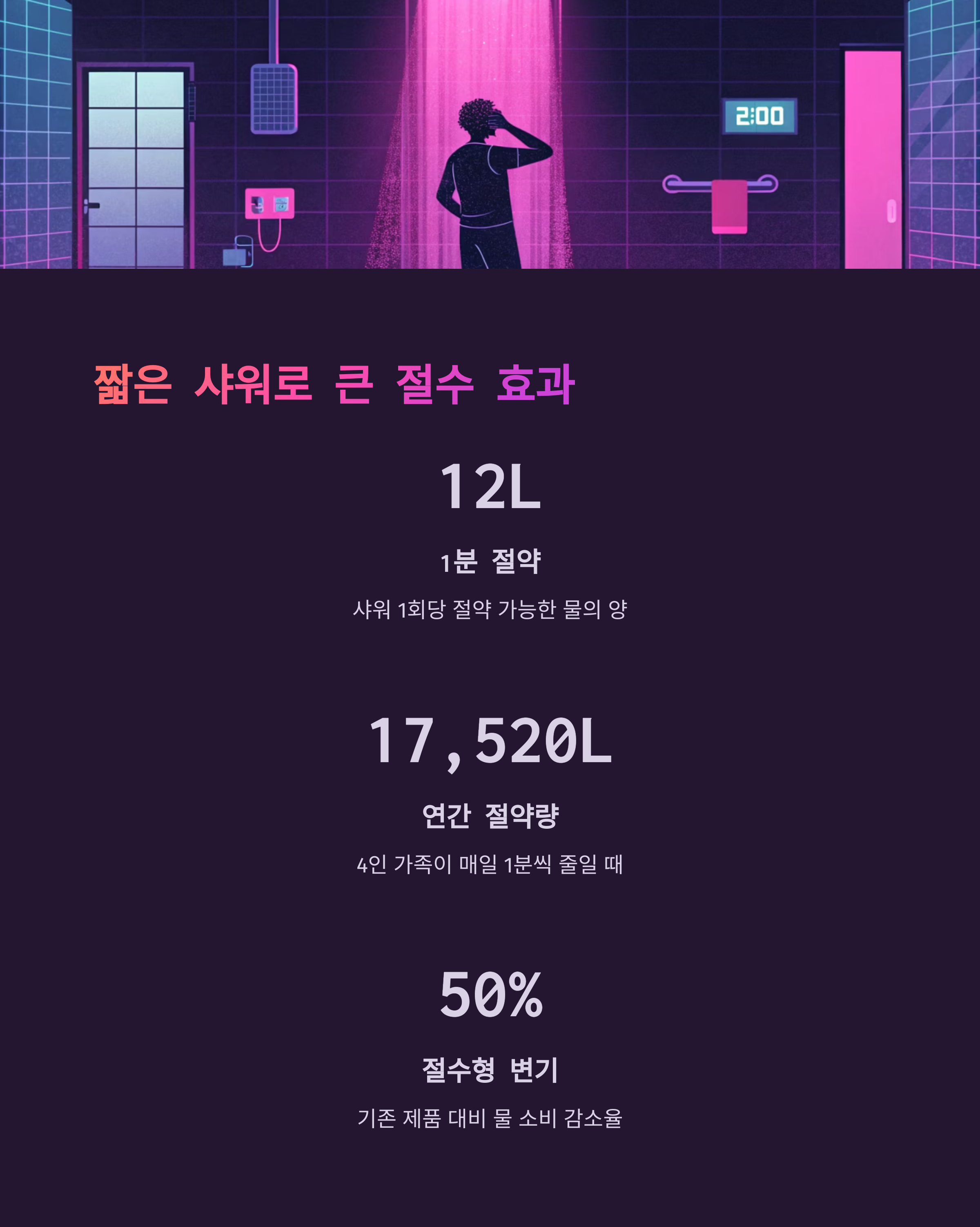 | 샤워시간 1분 단축 | 4인 가족 연 17,520리터 물 절약 | 절수 샤워기 병행 시 효과 상승 |