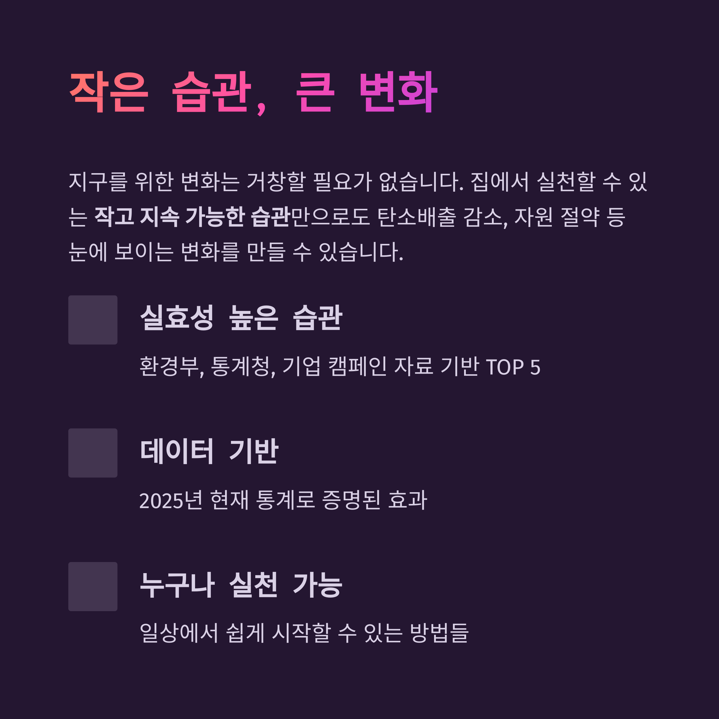 집에서 실천할 수 있는 작고 지속 가능한 습관만으로도 탄소배출 감소, 자원 절약 등