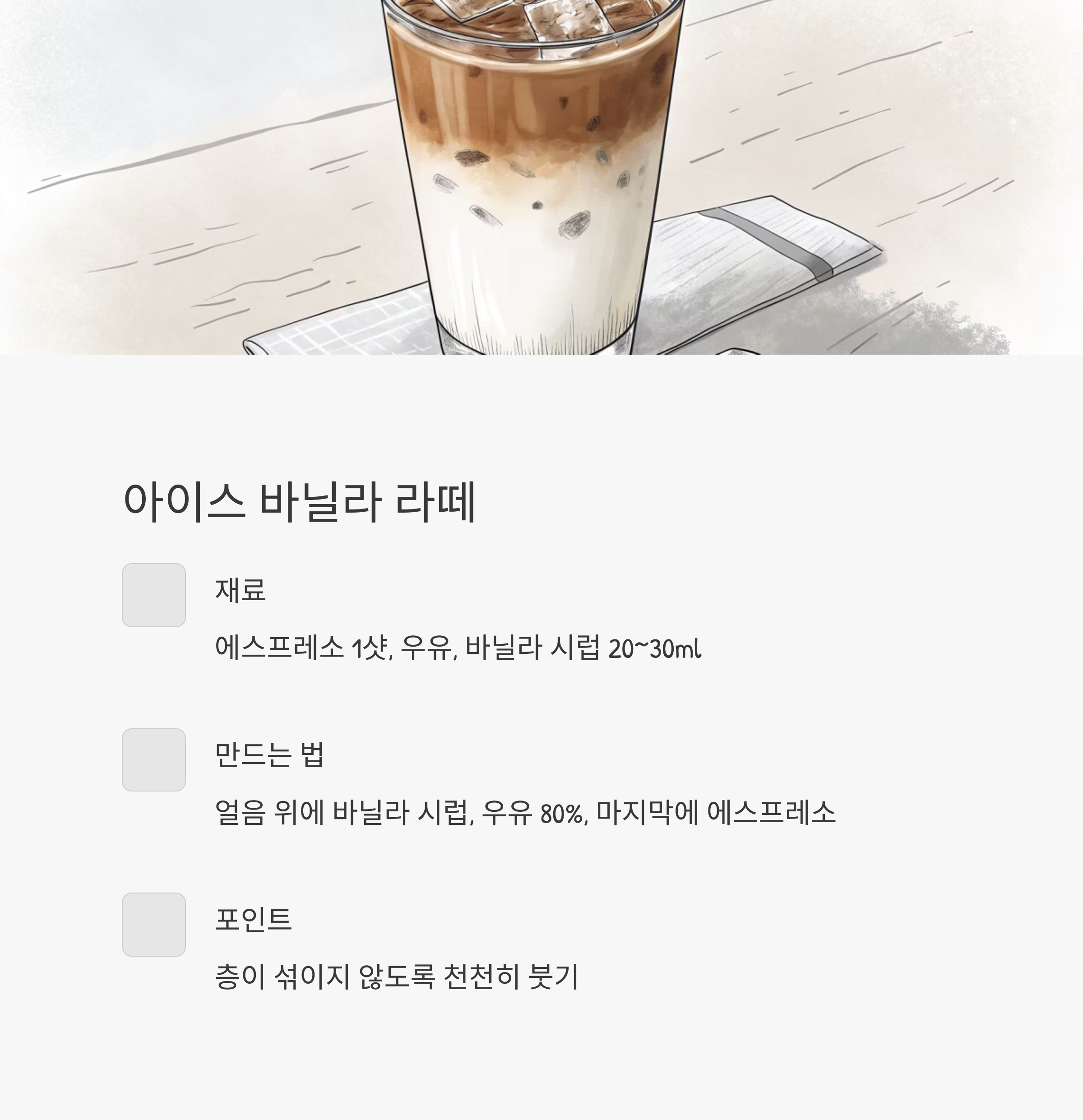| 아이스 바닐라 라떼 | 에스프레소 1샷, 우유 80%, 시럽 20~30ml | 클래식한 홈카페 라떼 완성 |