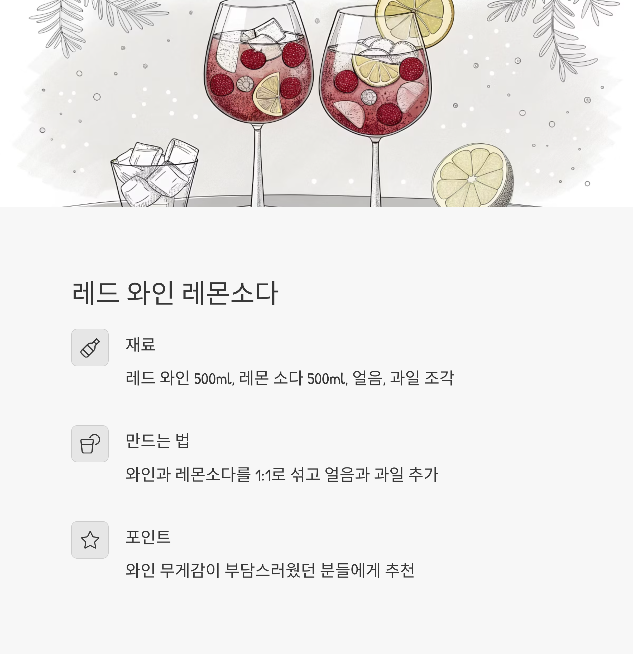| 와인 레몬소다 | 레드 와인 500ml, 레몬소다 500ml | 클래식 와인의 색다른 즐거움 |