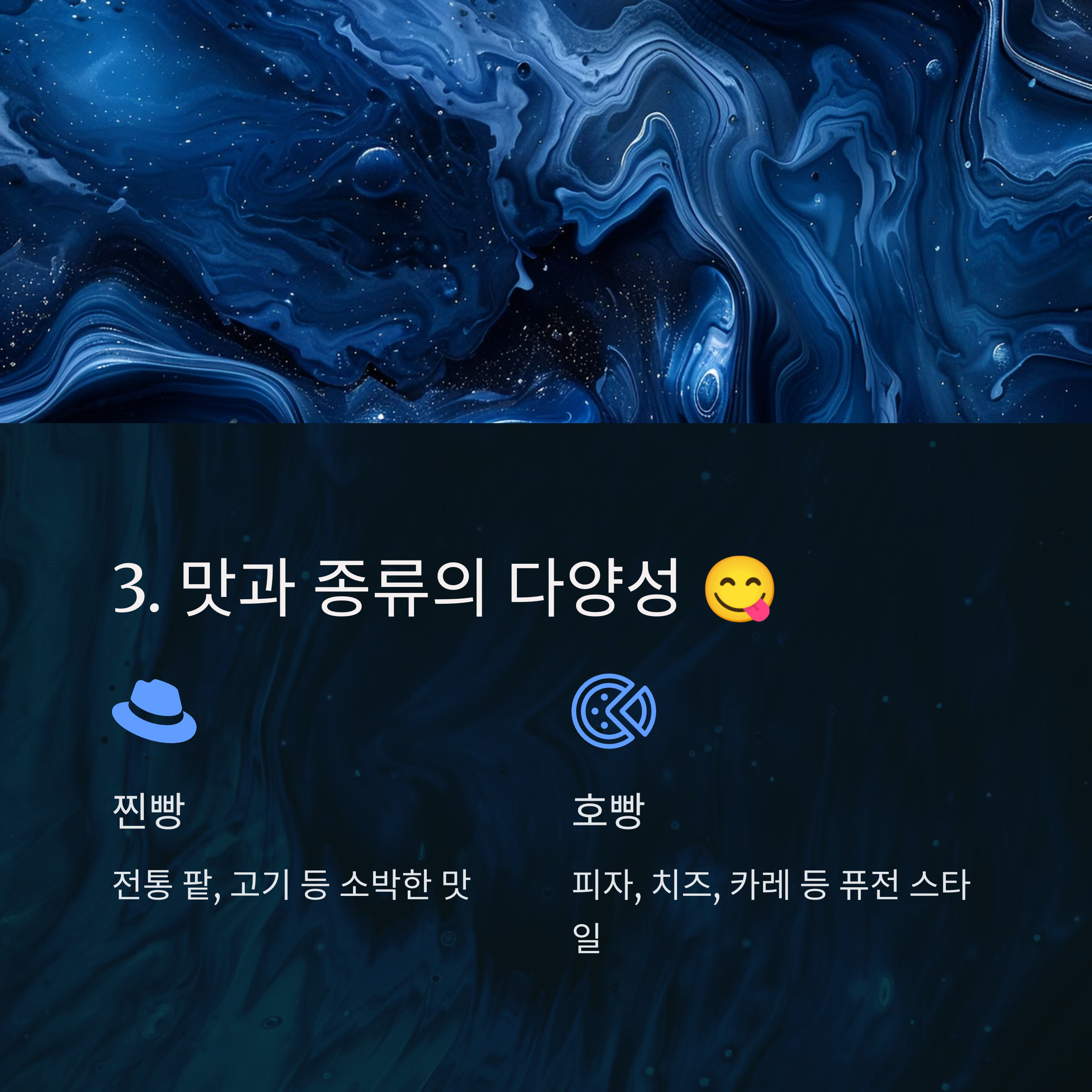 | 대표적인 맛 | 팥, 단호박, 흑임자 | 팥, 피자, 불닭, 크림치즈 |