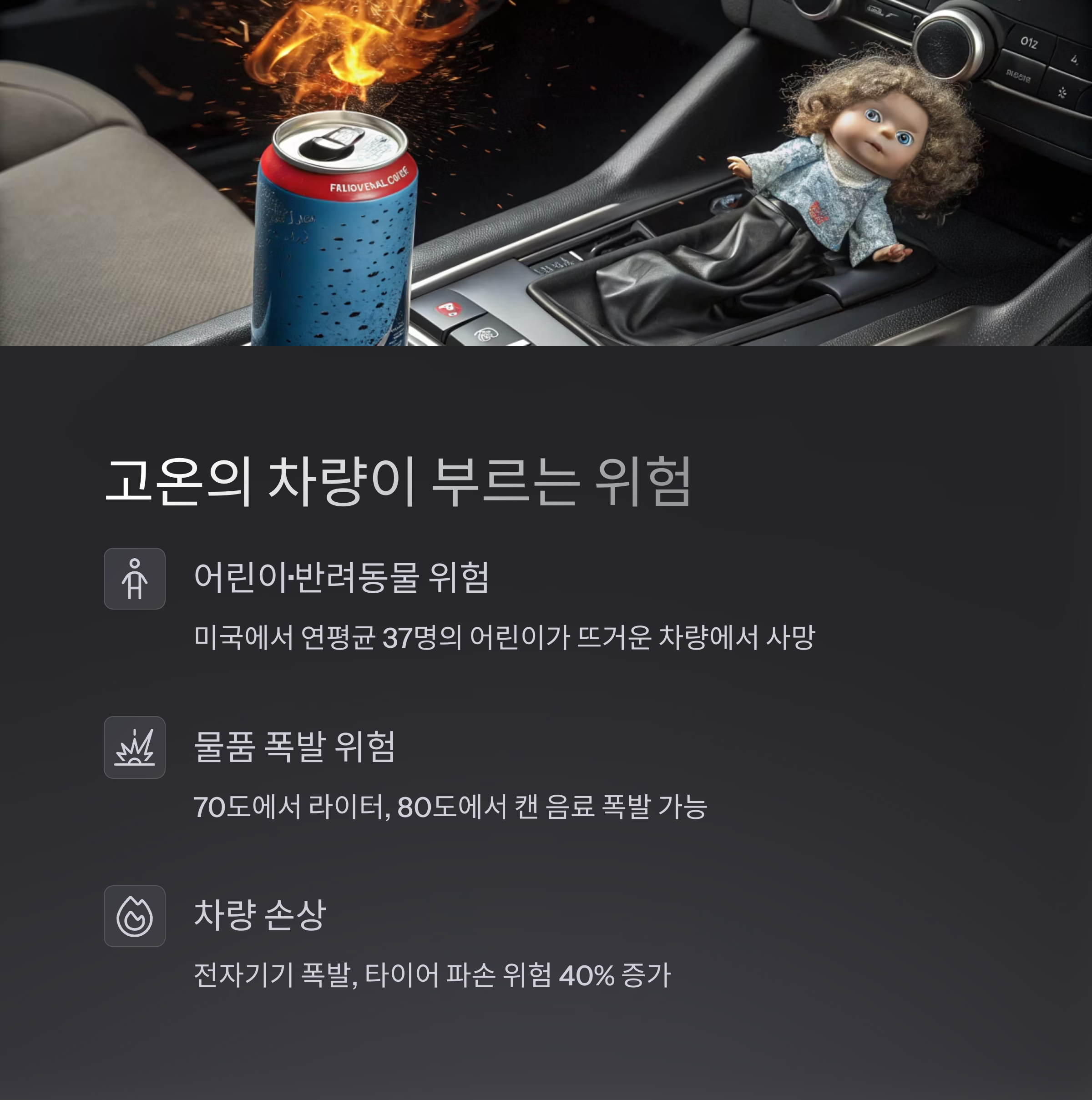 • 어린이·반려동물 방치 시: 열사병, 질식, 뇌손상 위험